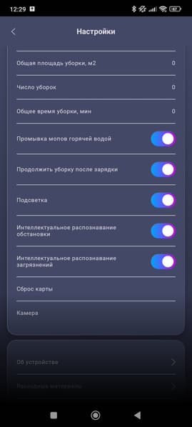 Тут мы можем настроить дополнительные параметры уборки (поведение робота на коврах, уборка по расписанию, режим двойной уборки и т. п.), а также вручную включить очистку и просушку мопов, очистку от волос, сброс пыли...