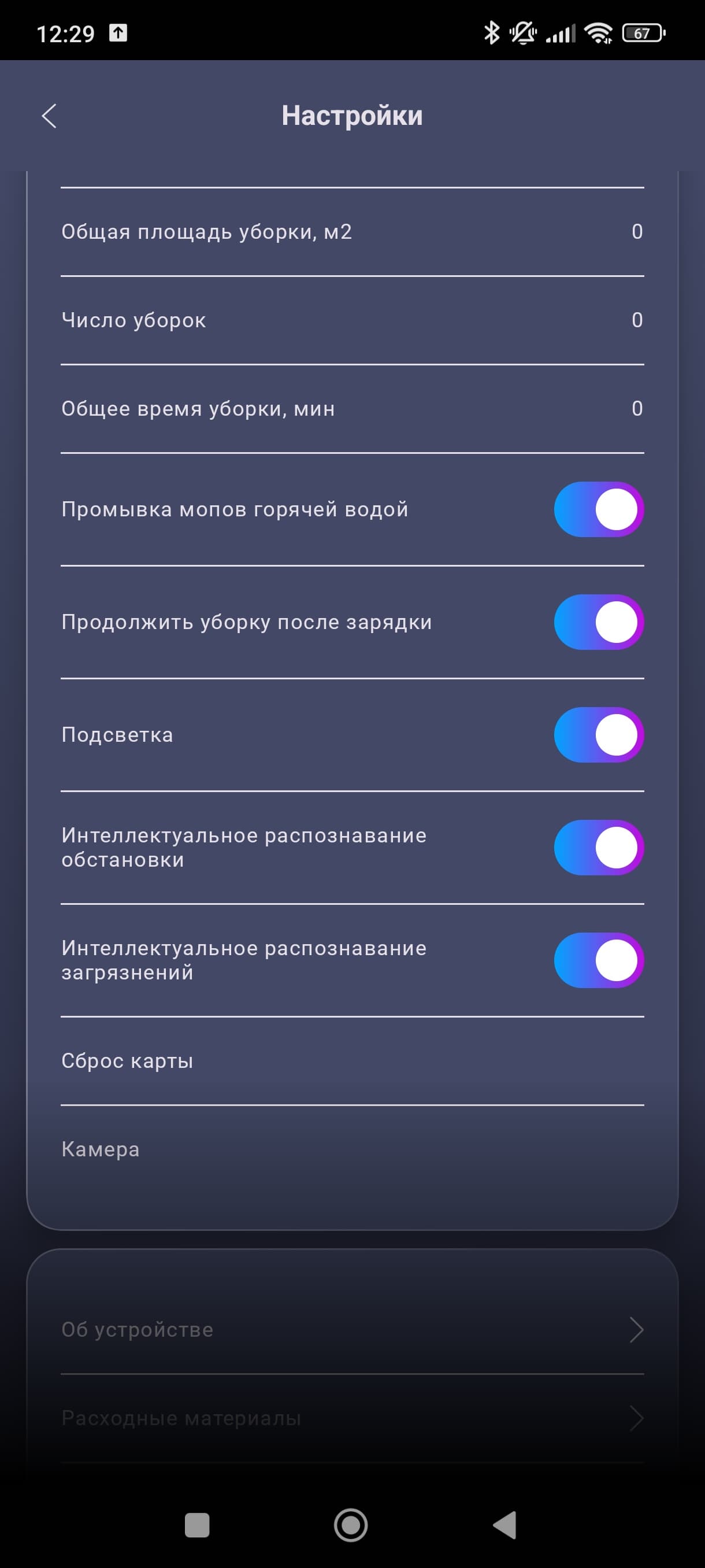 В разделе «Настройки» мы можем изменить еще несколько опций, посмотреть статистику уборок и степень износа расходных материалов, настроить громкость, выбрать языковой пакет робота и т. п. Отметим, что тут же мы можем передать права на управление роботом другим пользователям (например, членам семьи). Сразу же обращаем внимание на новый пункт — интеллектуальное распознавание обстановки.