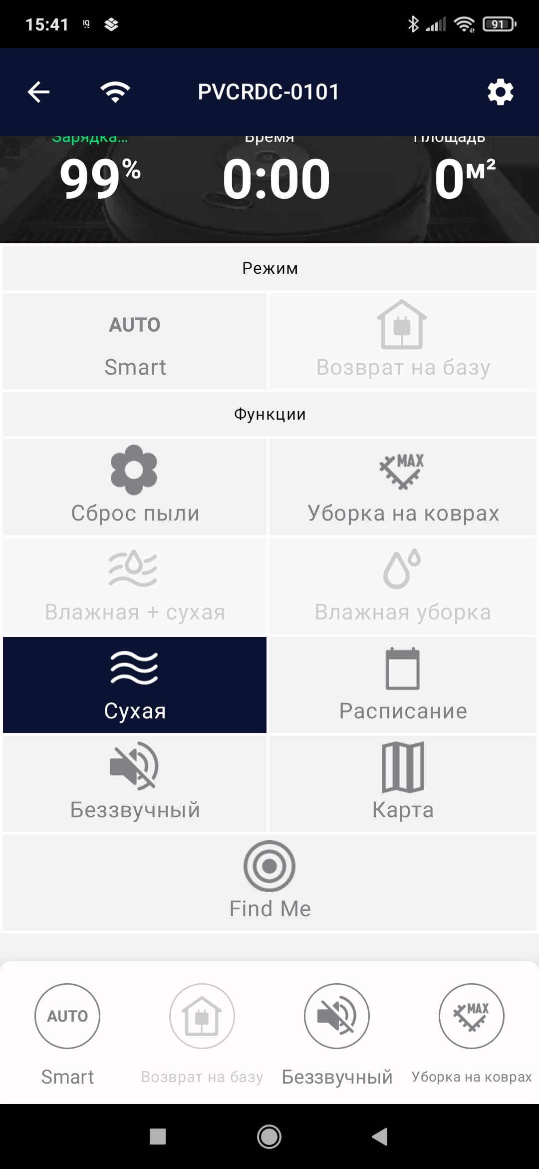 Прибор исправно включается и выключается, возвращается на базу для подзарядки, меняет мощность всасывания, а также позволяет запланировать отложенную уборку (понимает команды типа «пропылесось через 2 часа»).