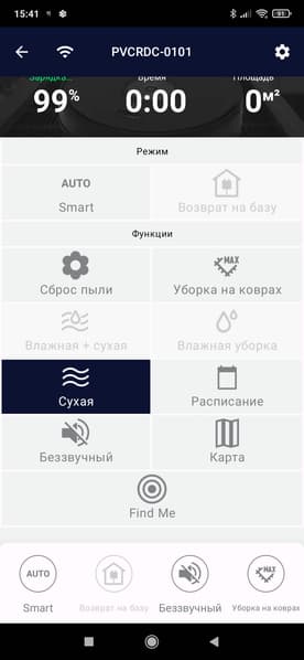 После запуска мы видим типичный «пульт управления». Тут мы можем начать управлять устройством в ручном режиме, запустить уборку или отправить устройство на базу. Ниже находятся кнопки сброса пыли, усиления мощности на коврах, выбора режима уборки (сухая, влажная+сухая, влажная). Тут же можно настроить расписание уборок по сложным правилам, включить беззвучный режим (пригодится в случае, если устройство предполагается запускать ночью), а также просмотреть и отредактировать карту (или карты, если их несколько).