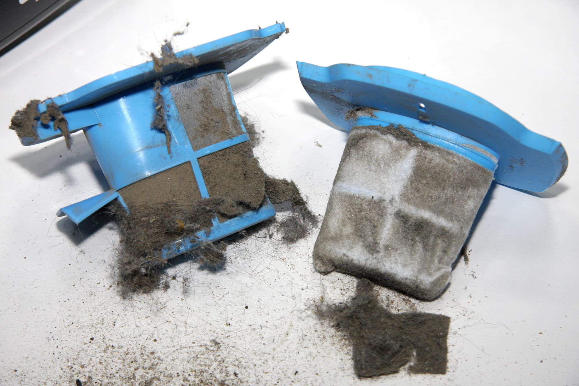 Для тщательной очистки нужно снять пылесборник в сборе с фильтрами, для чего нажимается голубая кнопка сверху под индикатором заряда. Фильтры вставляются друг в друга, первый — это пластиковая сеточка и дырочки на дне, второй — волокнистый материал на рамке. Пластик второго фильтра упругий (полиэтилен), поэтому юбочки по периметру и в центре работают как уплотнители, исключающие паразитный подсос воздуха мимо фильтров.