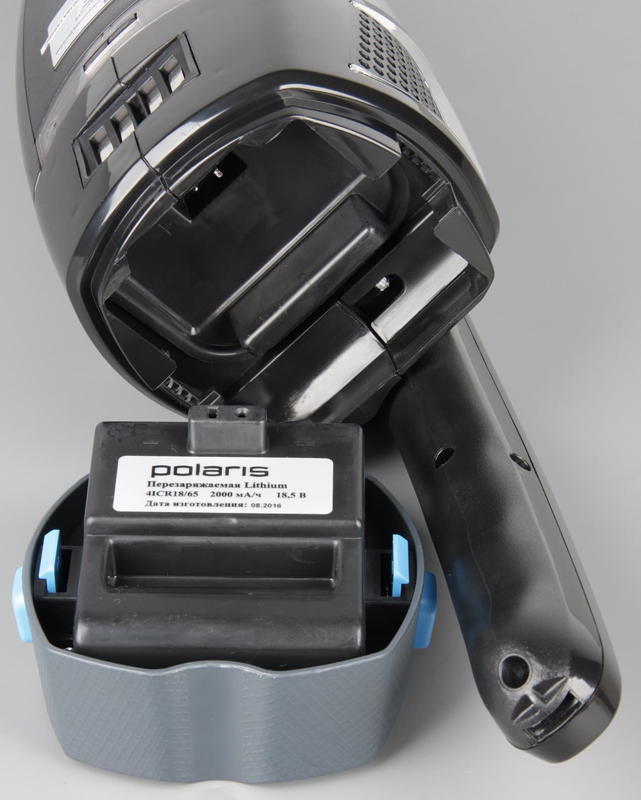 Основные детали пылесоса изготовлены из пластика в основном черного или темно-серого цвета без покрытия с просто матовой шершавой поверхностью, с рельефным узором или с зеркально-гладкой поверхностью, которая, конечно, не устойчива к появлению царапин. У выпускных решеток, под переключателем режимов и вокруг индикатора заряда есть декоративные рамки с прочным зеркальным металлизированным покрытием. Нижняя часть ручки основного корпуса, где ее держит пользователь, имеет противоскользящую накладку из упругого пластика голубого цвета. Нижняя часть ручки мобильного блока просто шершавая. Голубые элементы обычно обозначают органы управления или нажимные фиксаторы, но вот крышки шарнира — это просто крышки, так как кнопка фиксатора шарнира находится выше. Нажав на эту кнопку ручку можно сложить вверх, чтобы, не нагибаясь, подсунуть нижнюю часть пылесоса под предметы обстановки.