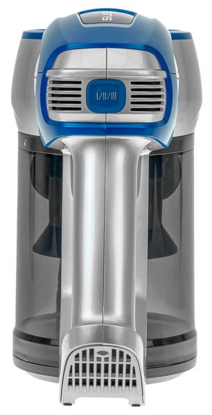 Решетки выпускного отверстия расположены в торце моторного блока, обращенного к пользователю. Между ними находится синяя кнопка, регулирующая мощность всасывания.