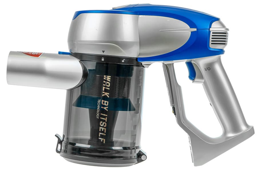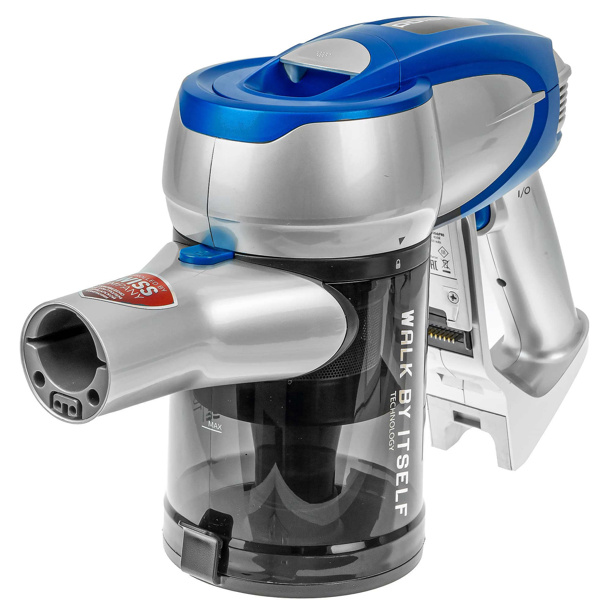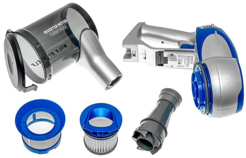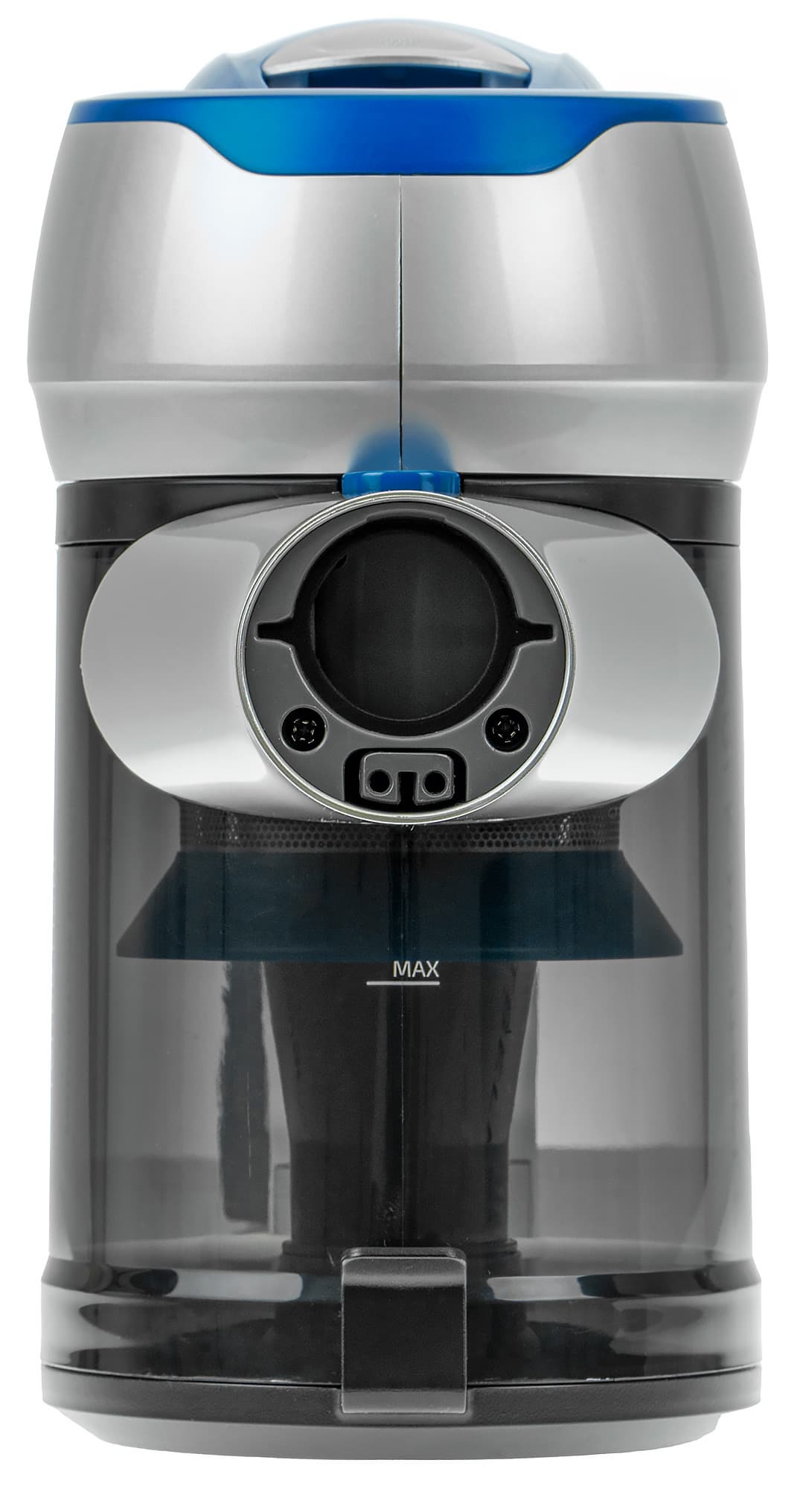 Корпус моторного блока выполнен из серебристого пластика с ярко-синими декоративными элементами. Его компоновка традиционна для аккумуляторных пылесосов с поперечным циклонным фильтром: двигатель прибора расположен над емкостью мусоросборника, в задней части корпуса размещается рукоятка пистолетного типа со «спусковым крючком», включающим прибор, а между рукояткой и мусоросборником есть место для съемного аккумулятора.