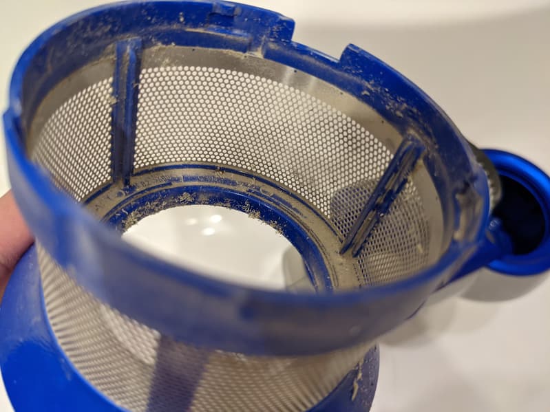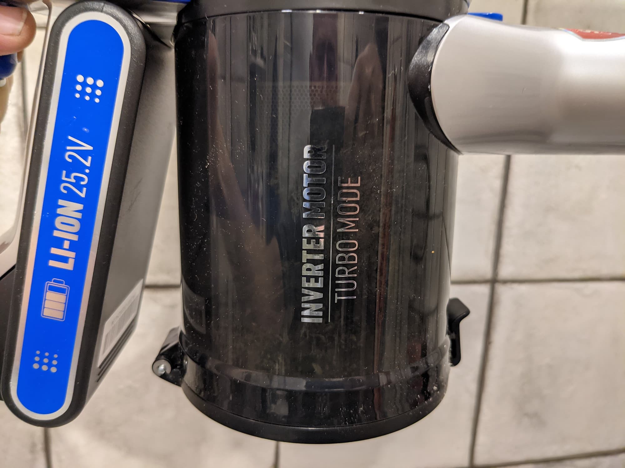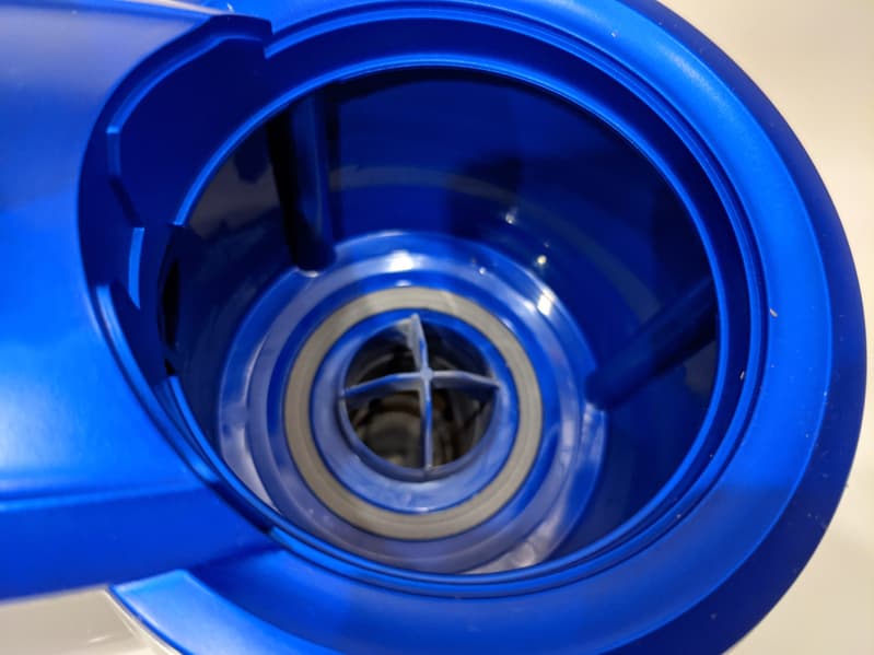 Крупный и тяжелый мусор оседает в нижней части емкости, средняя фракция отделяется цилиндрическим фильтром из металлической сетки, а мелкая пыль оседает на гармошке HEPA-фильтра, которые расположен в отдельном отсеке под крышкой на верхней панели прибора. Контейнер можно опустошить, открыв крышку на нижней стороне, снимать его с моторного блока не требуется. Полная разборка необходима только для чистки и мытья элементов циклона.