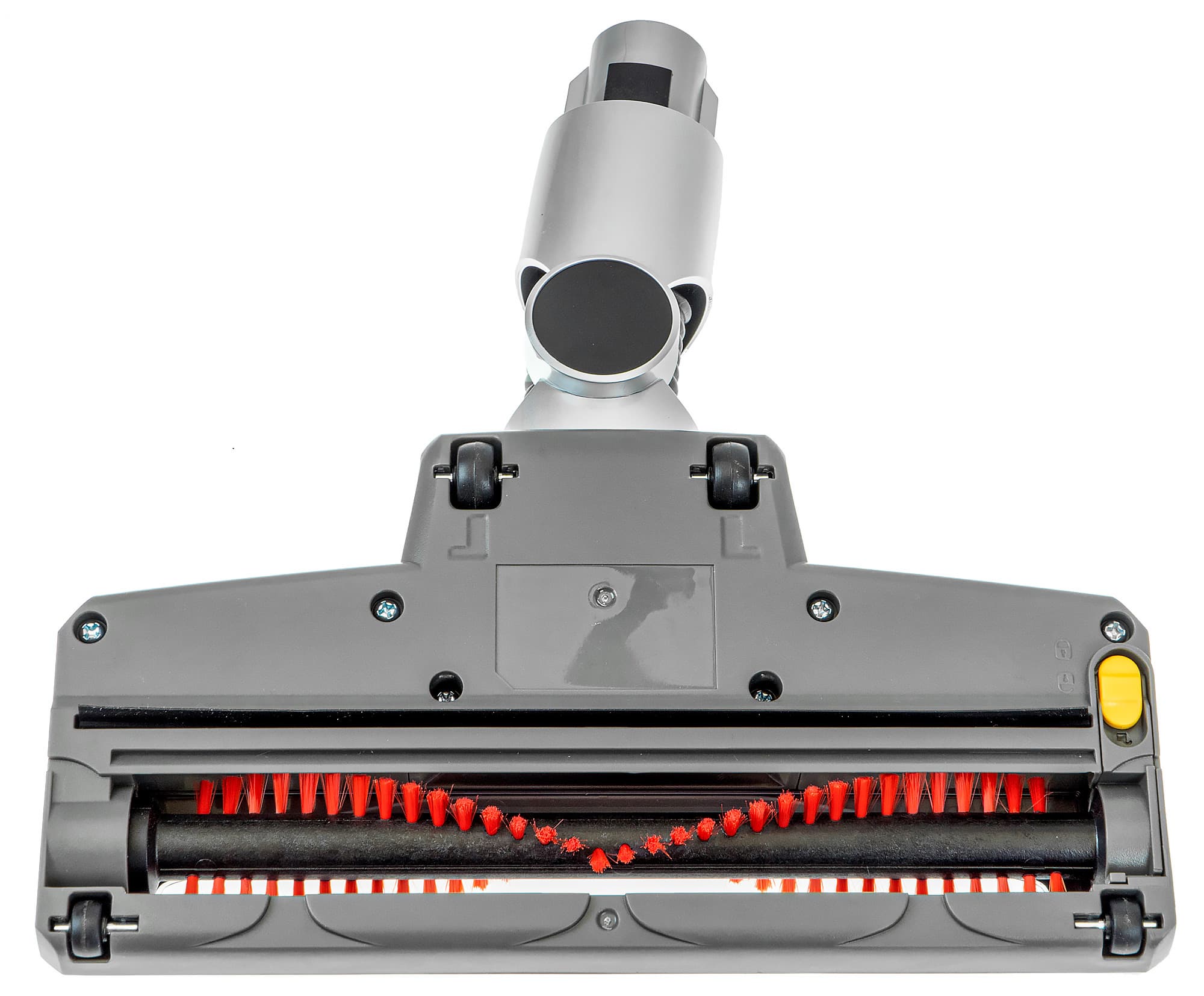 Щетка электронасадки снабжена двумя V-образными рядами щетины средней жесткости. Чтобы извлечь ротор для чистки, следует воспользоваться желтой кнопкой на нижней стороне насадки. Скольжение по полу облегчают четыре ролика: два в передней части и два — в задней.