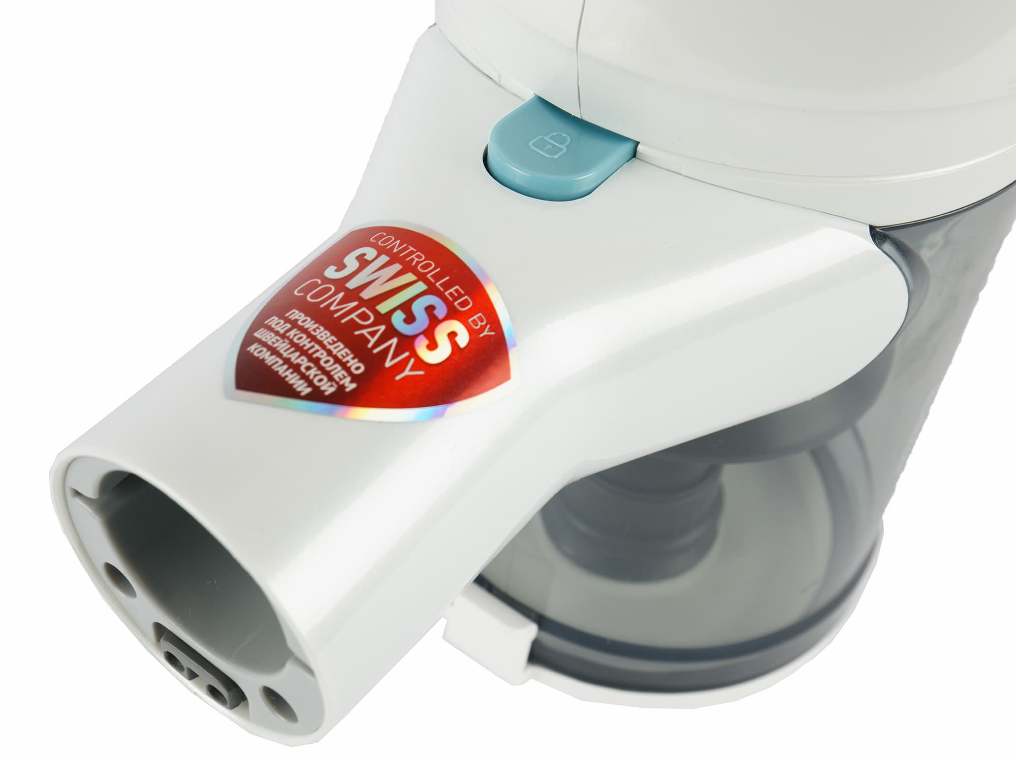 Из корпуса мусоросборника выступает сопло, снабженное розеткой для питания электронасадок. Оно украшено ярким шильдиком «Controlled by Swiss company» — таким же, как на упаковке.