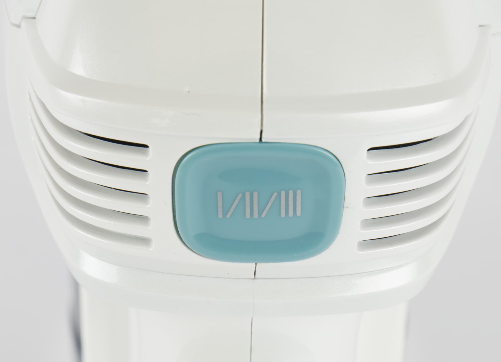 Мощность всасывания регулируется последовательным нажатием на кнопку в торце моторного блока. Включается пылесос на первой, минимальной скорости.
