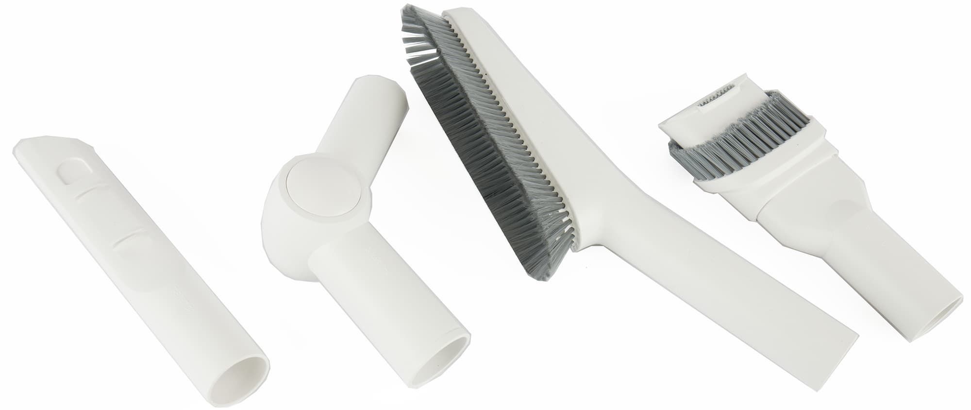 У немоторизованных насадок, входящих в комплект устройства — щелевого сопла, длинной одежной щетки и щетки-сопла, — конструкция простая и привычная. К насадкам прилагается также угловой шарнир, способный изгибаться на 90°.