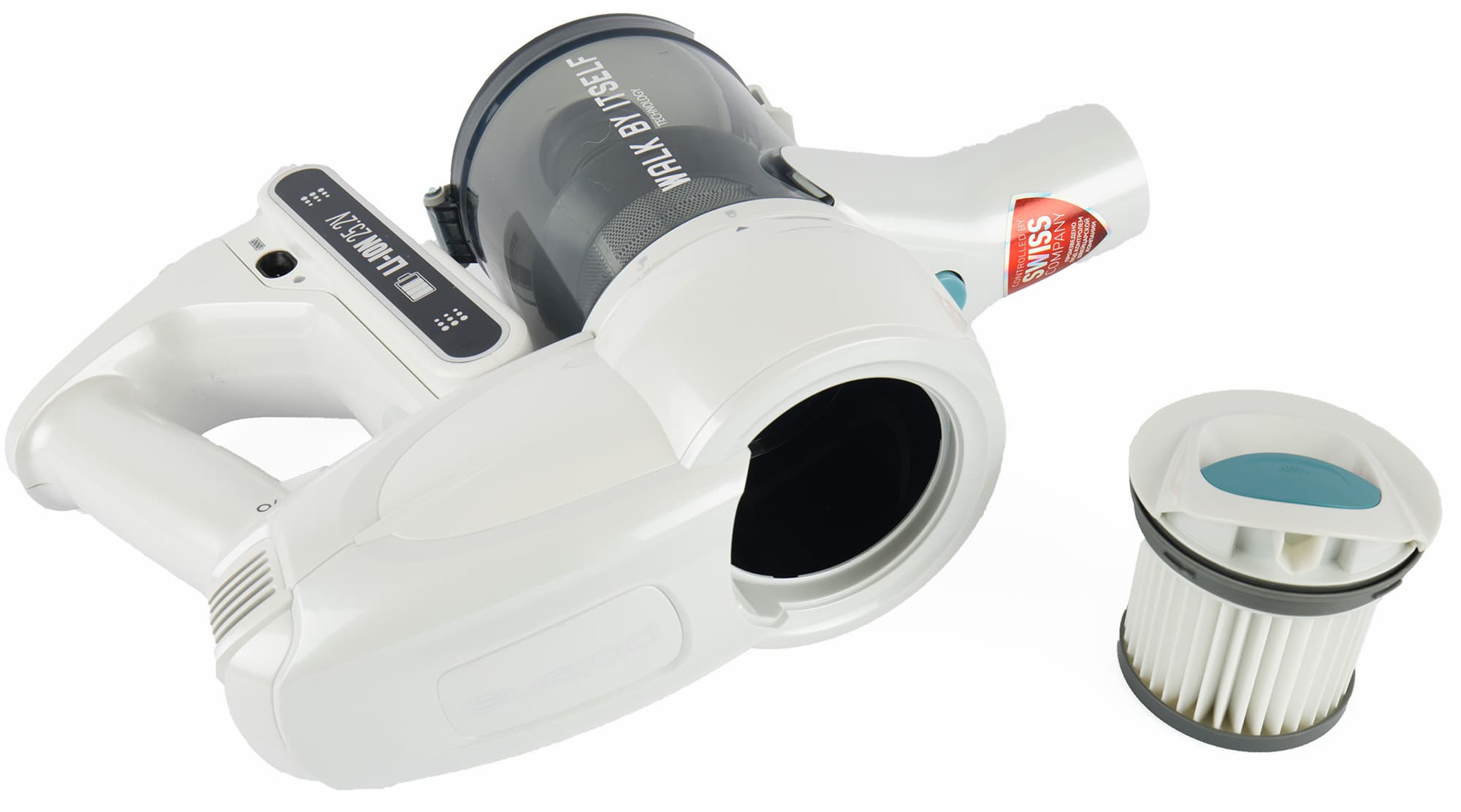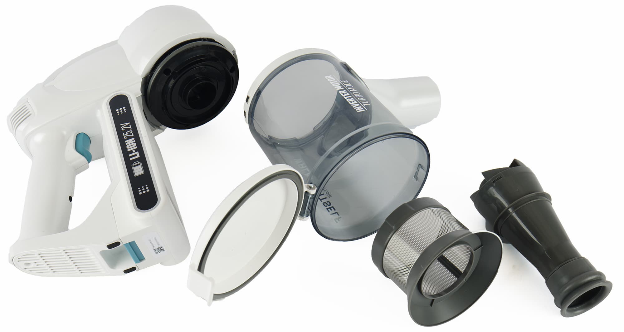 Фильтр циклонного типа расположен перпендикулярно воздушному тракту. Поток воздуха с пылью и мусором попадает в контейнер: его закручивает по часовой стрелке специально ориентированное входное отверстие. Контейнер можно опустошить, открыв крышку на нижней стороне, — снимать его с моторного блока не требуется. Полная разборка необходима только для чистки и мытья элементов циклона.