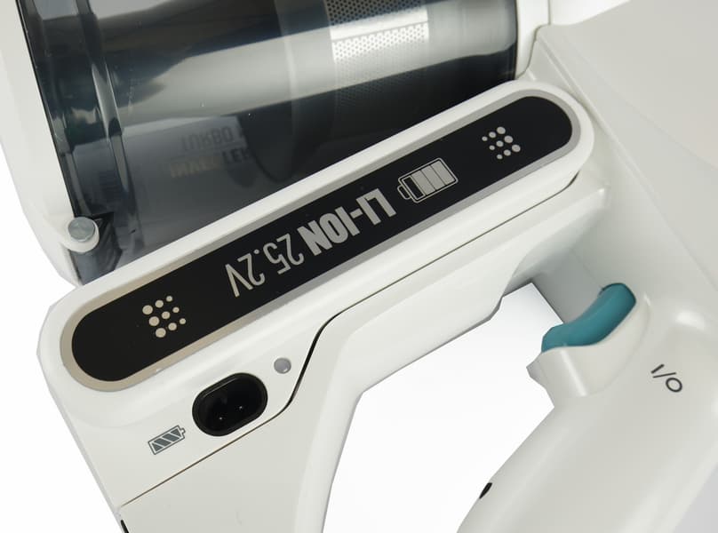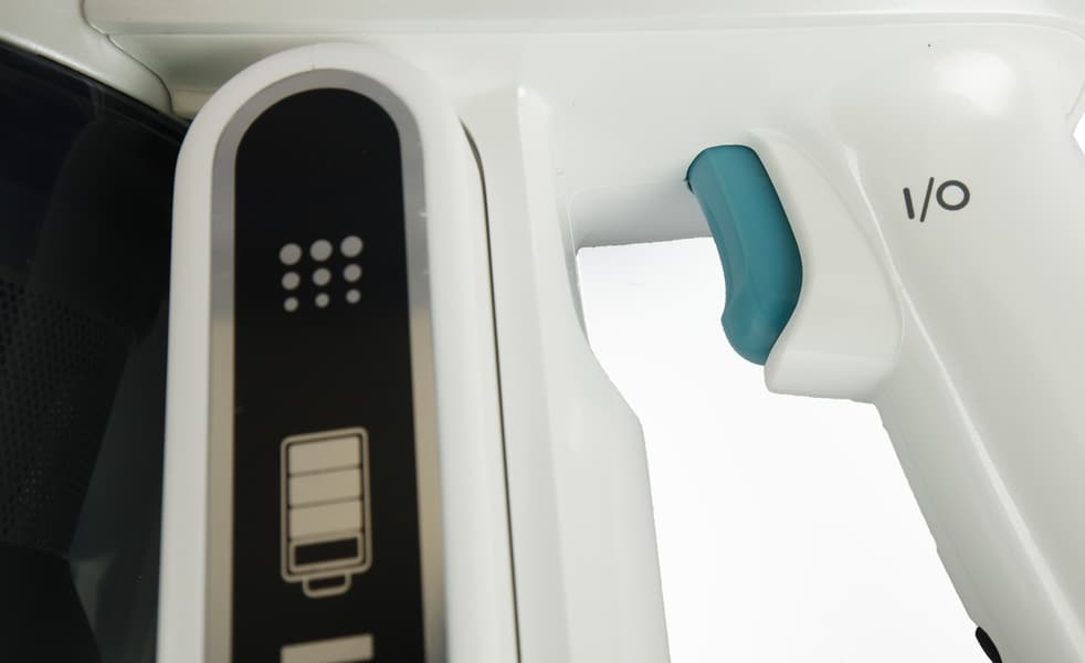 Между мусоросборником и рукояткой пылесоса размещается съемная аккумуляторная батарея, снабженная разъемом для подключения адаптера питания и светодиодным индикатором.