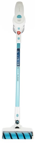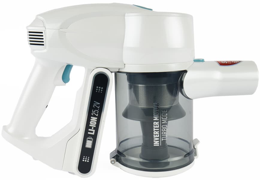 Корпус прибора выполнен из белого гладкого пластика. Его компоновка традиционна для аккумуляторных пылесосов с поперечным циклонным фильтром: двигатель расположен над емкостью мусоросборника, в задней части корпуса размещается рукоятка пистолетного типа со «спусковым крючком», включающим прибор. Между рукояткой и мусоросборником есть место для съемного аккумулятора.
