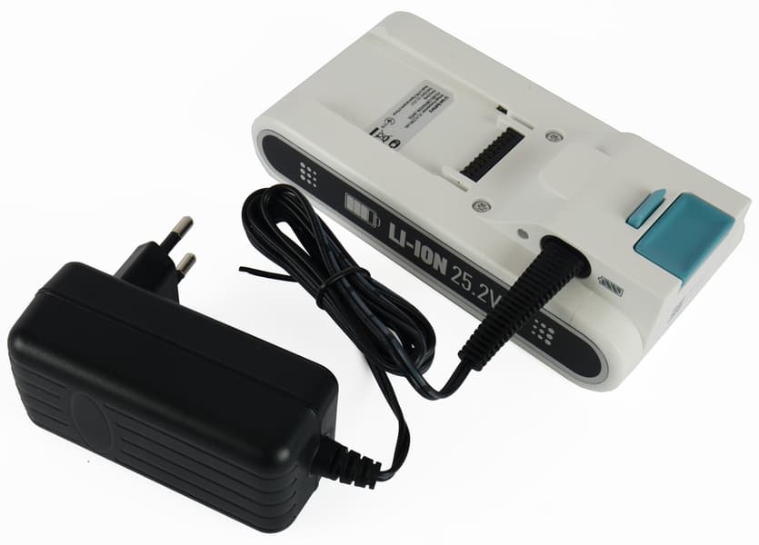 Так как адаптер питания подключается прямо к батарее, заряжать ее можно и без установки в пылесос. Такое решение позволяет не беспокоиться о необходимости парковать устройство рядом с розеткой: достаточно отстегнуть аккумулятор после уборки и подключить его к адаптеру в любом удобном месте квартиры.