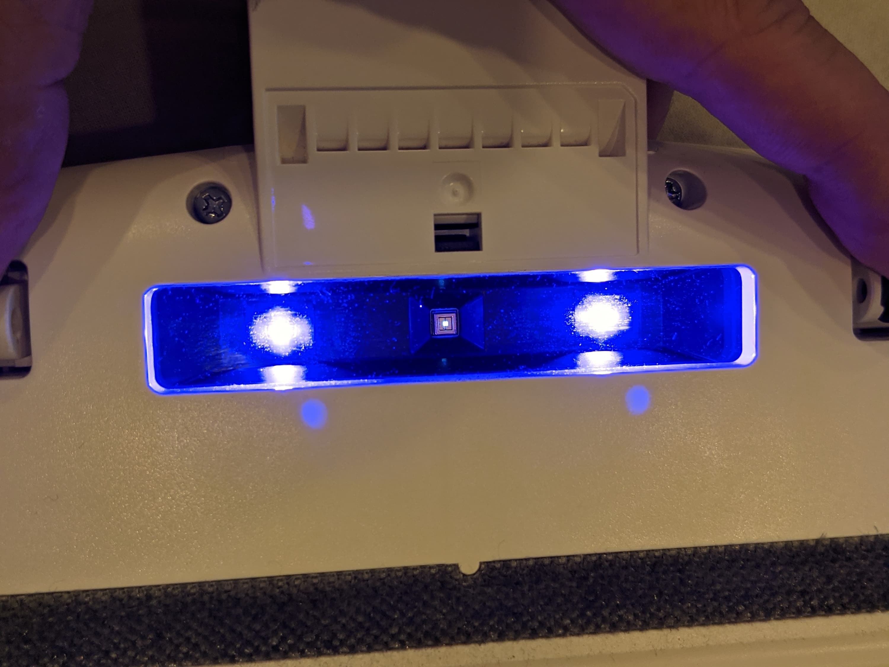 Излучатель снабжен механическими датчиками поверхности и срабатывает только при одновременном нажатии на подвижные ролики по бокам от окошка: как только давление на них прекращается, УФ-светодиоды гаснут. Так реализована защита глаз пользователя от вредного излучения.