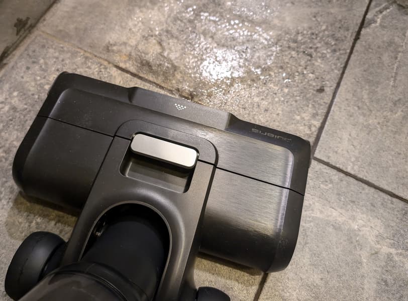 По умолчанию прибор работает в режиме сухой уборки: автоматической подачи воды на щетку в этой модели нет. Пользователь регулирует поступление жидкости при помощи кнопки на рукоятке: вода распыляется аккуратным веером из форсунки в передней части напольной насадки.
