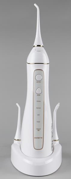 Прибор комплектуется с базой для беспроводной зарядки, которая также служит подставкой для самого ирригатора с двумя дополнительными насадками.