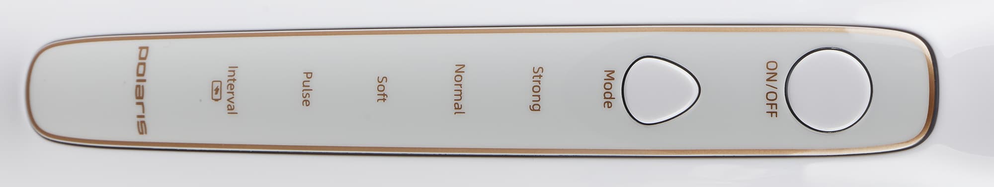Управляется устройство двумя кнопками. Круглая верхняя включает ирригатор в последнем выбранном режиме орошения, нижняя переключает режимы работы. Их у Polaris PWF 0201 пять.
