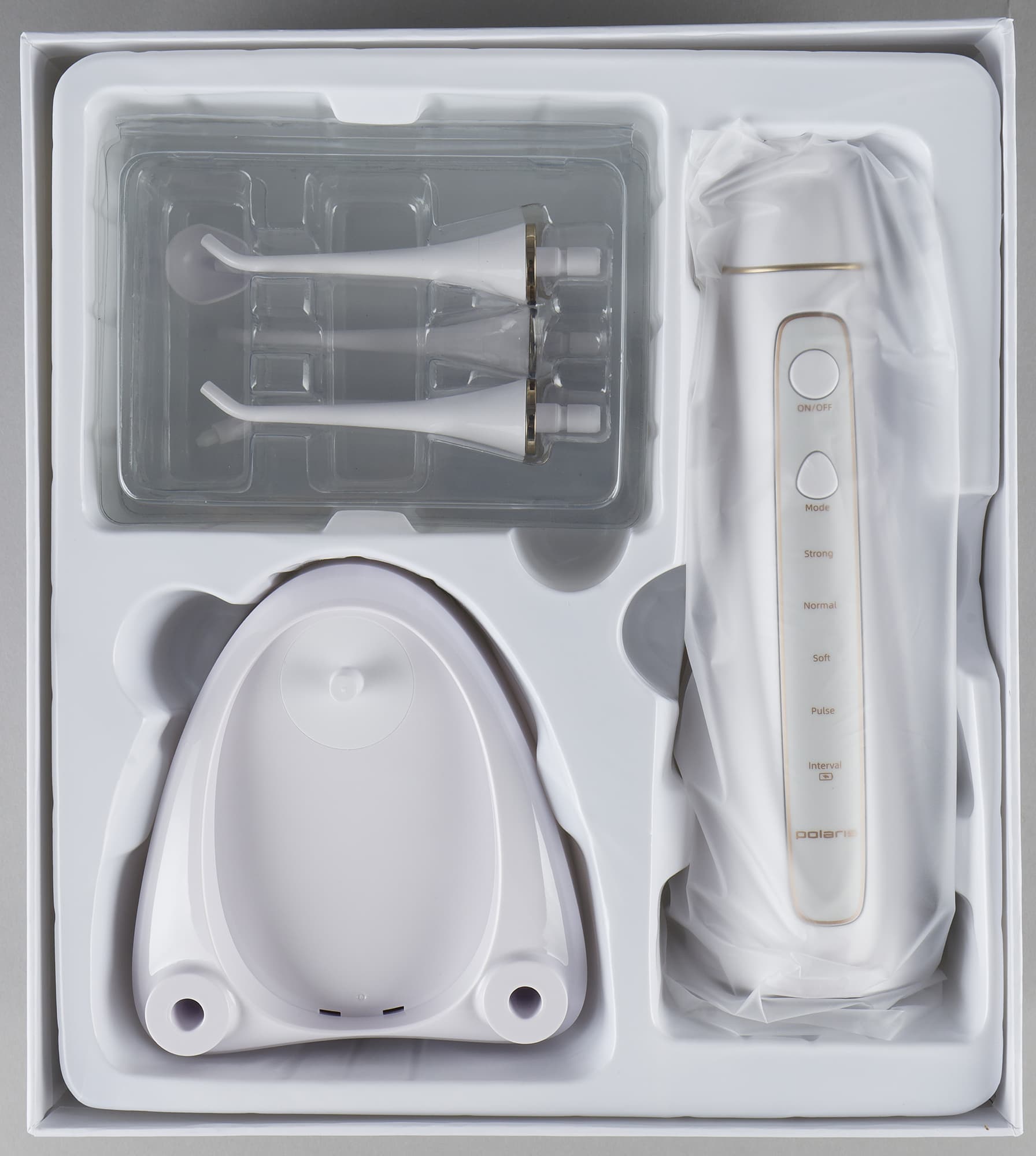 Информации на упаковке немного: на верхней крышке имеется изображение ирригатора на подставке, размещен логотип производителя и обязательный для Polaris значок, напоминающий, что устройство произведено под контролем швейцарской компании. Прибор сделан в Китае, но производитель гордится своими европейскими корнями.