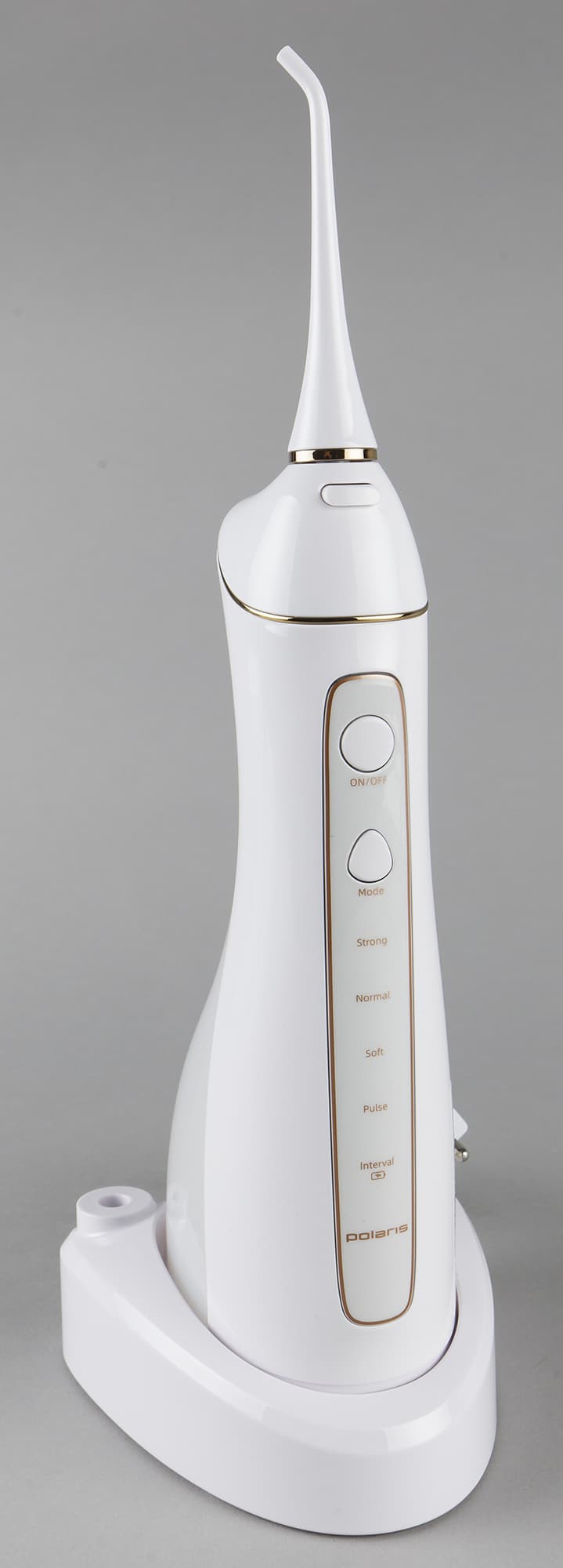 Портативный ирригатор Polaris PWF 0201 изготовлен из гладкого, приятного на ощупь стерильно-белого пластика и декорирован тонким золотистым кантом вокруг панели управления и гнезда для насадки. Благодаря эргономичной форме его приятно держать в руках, да и взор он тоже радует.