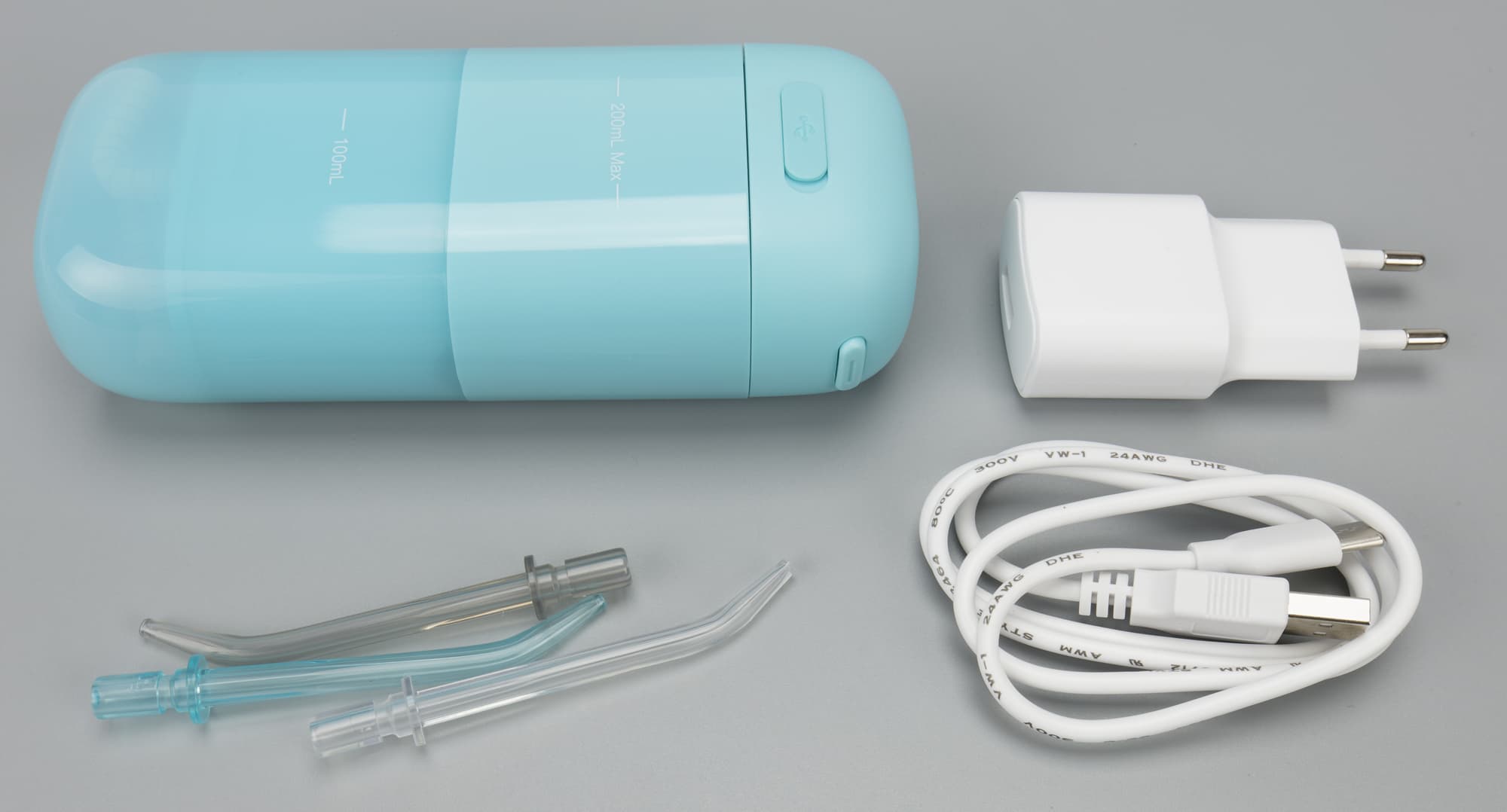 Прибор прибыл на тестирование в подарочном оформлении, где сама по себе приятная основная коробка спрятана в нарядный картонный чехол. «Всегда есть повод для улыбки» — гласит его слоган, сверху вписано имя бренда, на пастельном фоне изображены белые цветы. Основная коробка оформлена фирменным небольшим пеналом, на верхней белой крышке которого нанесен снимок ирригатора, имя бренда и сертификаты качества.
