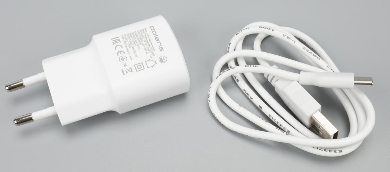 Заряжается портативный Polaris PWF 1002 T через стандартный шнур USB — от ноутбука, пауэрбанка или через вложенный в комплект адаптер. Производитель обещает, что для полной зарядки понадобится 4 часа, через час мы уже могли прибором спокойно пользоваться. Суммарное время работы, согласно инструкции пользователя, 120 часов, мы интенсивно пользовались им 5 рабочих дней, разрядить прибор за это время не удалось.
