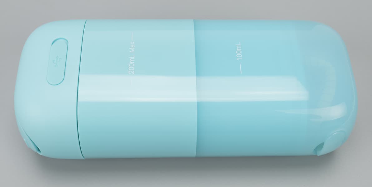 За ней — отверстие для залива воды, сбоку — порт для зарядки. Нижняя часть ирригатора — резервуар для воды с двумя отметками: 100 мл и 200 мл. Отверстие для залива и порт закрыты аккуратными заглушками. 200 мл — это предостаточный объем для одной, крайне тщательной чистки. Например, для послеобеденной гигиены обычно требуются те самые 100, и редко больший объем.