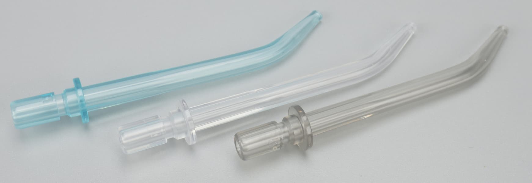 То же касается позы и техники работы с прибором, часто это дело привычки и комфорта. Согласно инструкции насадку мы направляем к деснам и зубам так, чтобы вода стекала вертикально вниз. В комплекте всего три одинаковых, классических насадки. Для того, чтобы ими могли пользоваться и не путать разные домочадцы, насадки выполнены в трех разных цветах.