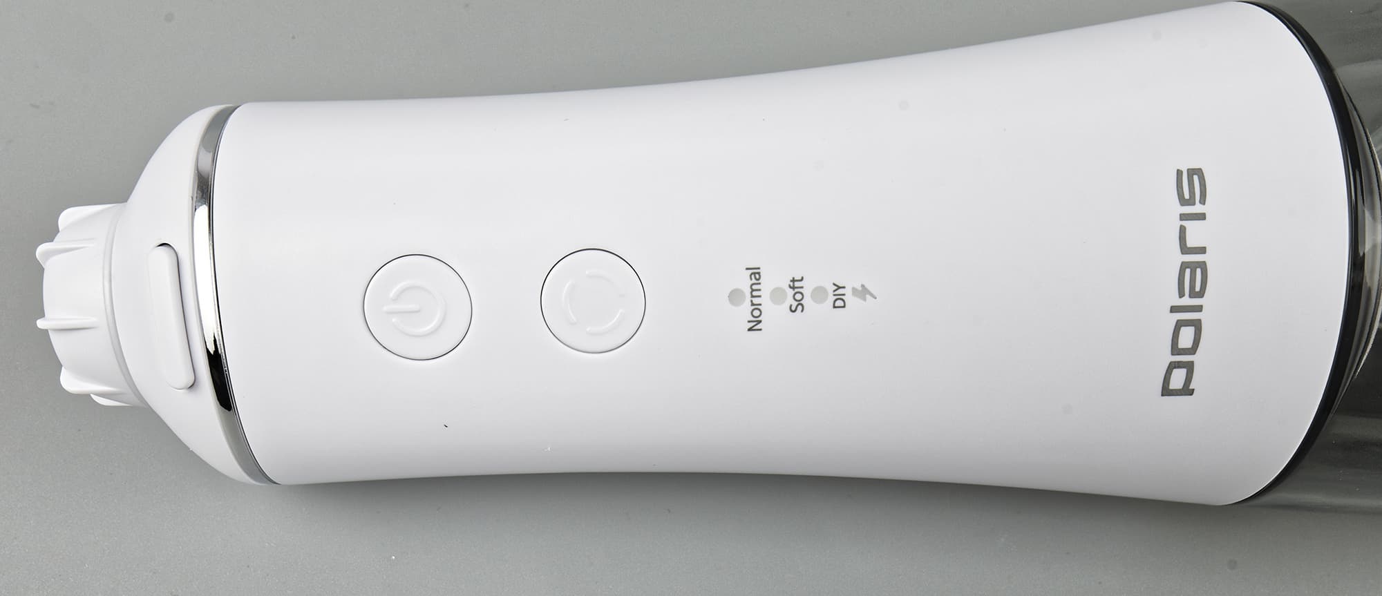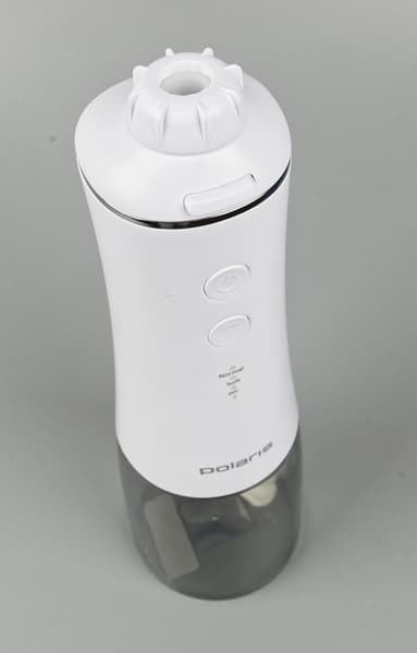 Корпус портативного ирригатора Polaris PWF 1004 W/T изготовлен из гладкого белого пластика. Он хорошо сочетается с прозрачным затемненным пластиком резервуара для воды. На лицевой стороне корпуса мы видим две кнопки управления, три подписанных индикатора режимов и индикатор заряда.