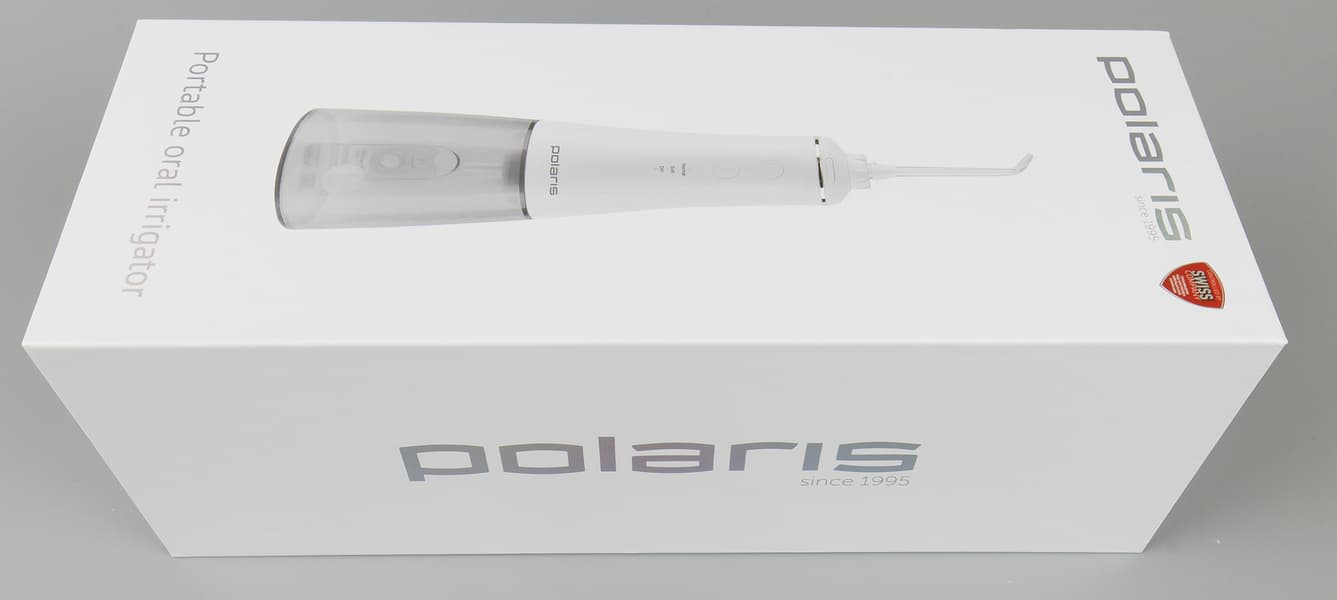 Ирригатор Polaris PWF 1004 W/T поставляется в симпатичной и элегантно оформленной коробке белого цвета. Глянцевый плотный картон производит приятное впечатление, так что коробка вполне может служить подарочной. Тем более она не перегружена информацией, хотя все самое важное — внешний вид устройства и его характеристики — пользователь может найти без труда. QR-код на задней стороне упаковки ведет нас на страницу прибора на официальном сайте компании Polaris.