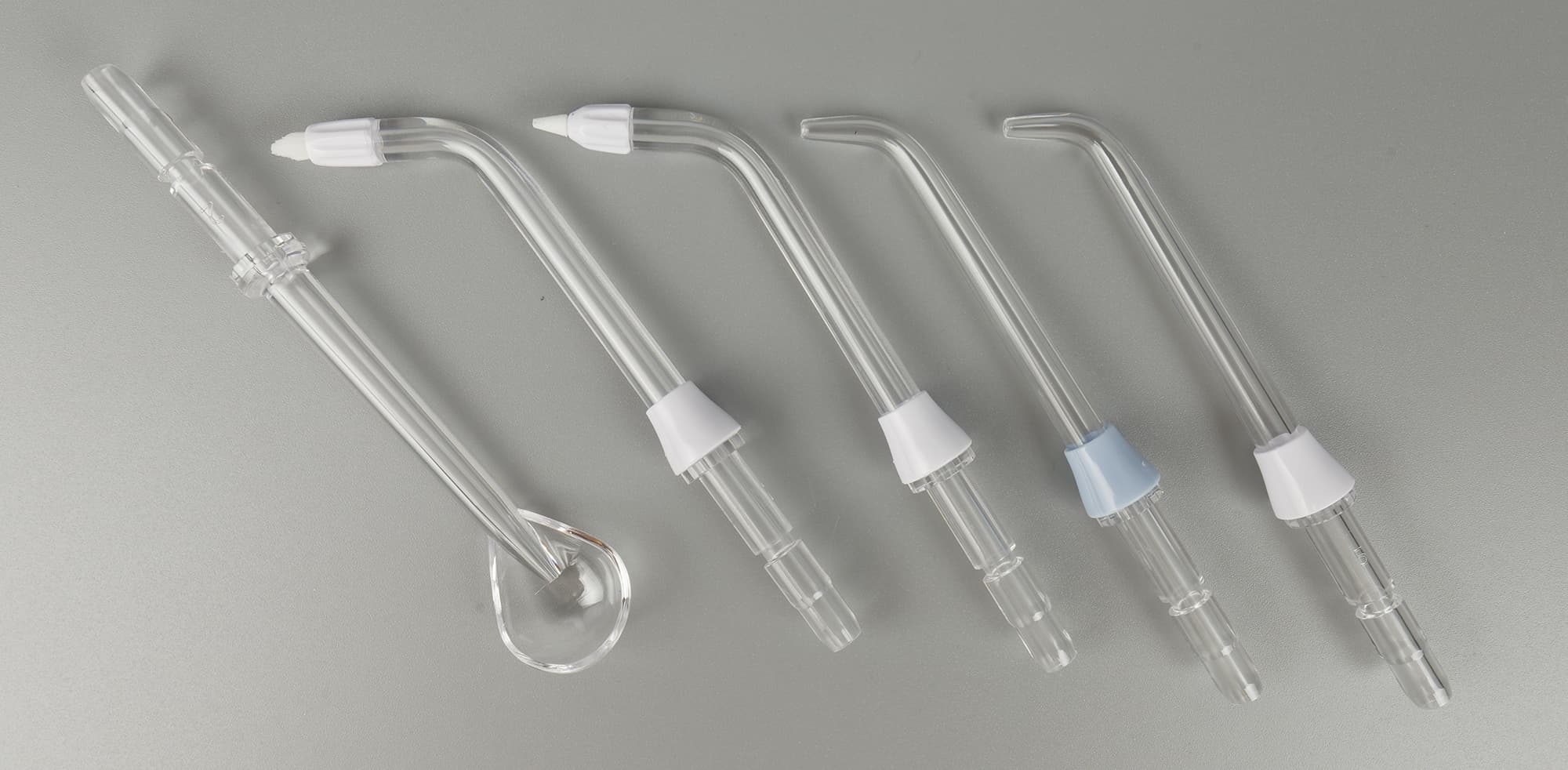 Ирригатор укомплектован пятью насадками. Ободки двух классических насадок имеют разные цвета — белый и голубой, что позволит не перепутать аксессуары при использовании прибора двумя членами семьи. Классическая насадка подает тонкую струю воды, которая очищает межзубные промежутки от бактерий и частиц пищи, подходит также для очистки искусственных конструкций. Пародонтологическая насадка имеет мягкий наконечник, с помощью которого можно безопасно и эффективно очистить десневой край. Ортодонтическая насадка представляет собой пучок щетинок, выстриженных конусом к центру. Предназначена она для чистки искусственных стоматологических конструкций. Предназначение ложки для чистки языка, думаем, объяснять не нужно.