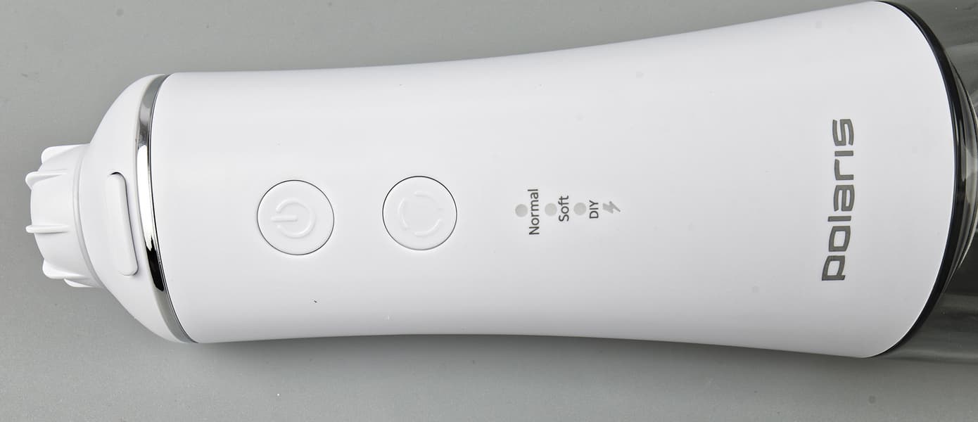 Панель управления ирригатором Polaris PWF 1004 W/T состоит из двух кнопок и четырех индикаторов. Верхняя кнопка — все просто — включает и отключает прибор, ниже находится кнопка переключения режимов, и вот этот процесс уже интереснее. Выбор и переключение режимов происходят при коротком нажатии, но если надавливать все время коротко, то пользователь перемещается между тремя имеющимися на корпусе индикаторами режимов. Как же попасть в режимы DIY 1/2/3/4? Для этого нужно длительно удерживать кнопку переключения режимов. Индикатор при этом тоже изменяет свое свечение: