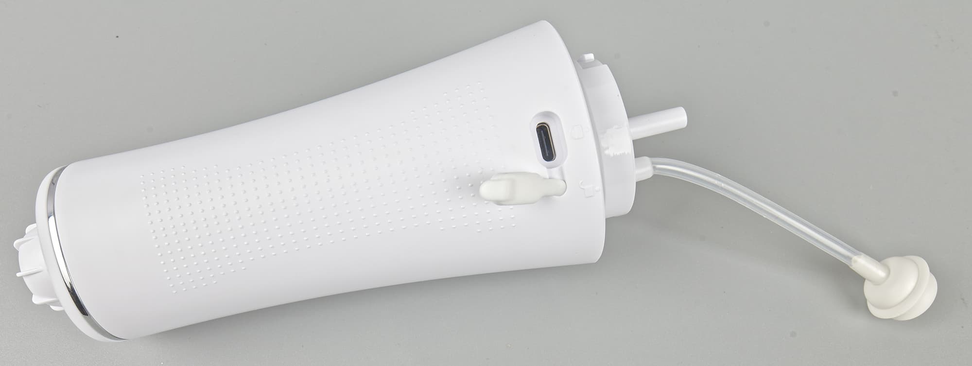 Полностью заряженный прибор отработал в режиме Normal 59 циклов. Под циклом мы подразумеваем процесс опустошения полного резервуара. Продолжительность 59 циклов соответствует примерно 68 минутам, что даже превосходит заявленное производителем время работы. Время работы без подзарядки нас порадовало: семье из двух человек потребуется подключать ирригатор к электричеству не чаще раза в пару недель, а один человек может пользоваться прибором без подзарядки месяц!