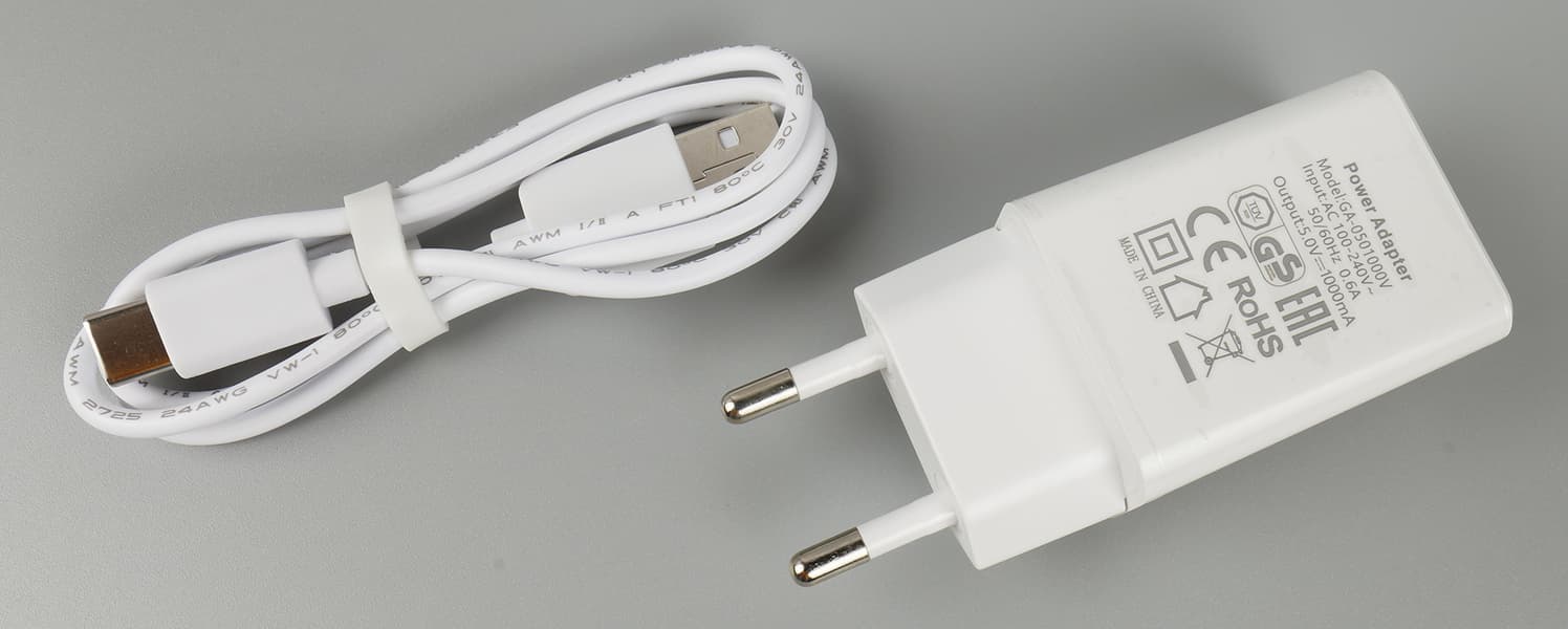 Адаптер зарядки и USB-кабель выглядят стандартно и ничем не примечательны.