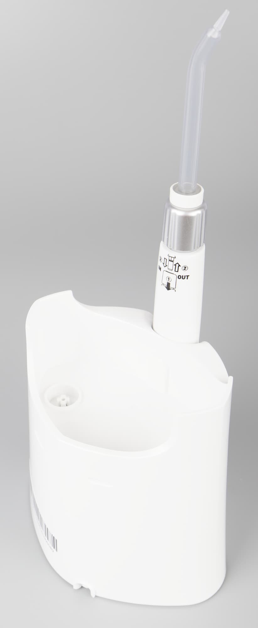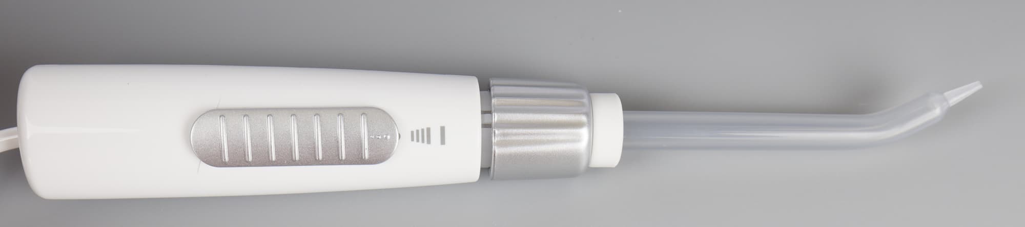 Прибор симпатично выглядит и удобен в эксплуатации. Отдельно отметим, что переключатель-бегунок на рукоятке позволит мгновенно приостановить подачу воды при возникновении дискомфорта. Очень удобно — не нужно отключать ирригатор через кнопку на корпусе и впоследствии начинать чистку заново. Эти особенности могут оказаться важны при использовании прибора детьми, пожилыми людьми и при кровоточивости десен (или просто если вдруг струя попала в особо чувствительное место).