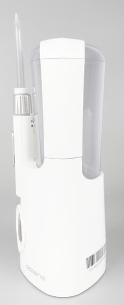 Коробка состоит из двух частей, плотно вставляющихся друг в друга. Внутри находится прочный пластиковый вкладыш, повторяющий по форме корпус ирригатора, благодаря чему прибор надежно фиксируется. Зарядное устройство и насадки мы нашли внутри резервуара для воды, упакованными в полиэтиленовые пакеты. Упаковка надежно защищает прибор и все комплектующие от повреждений при транспортировке и хранении.