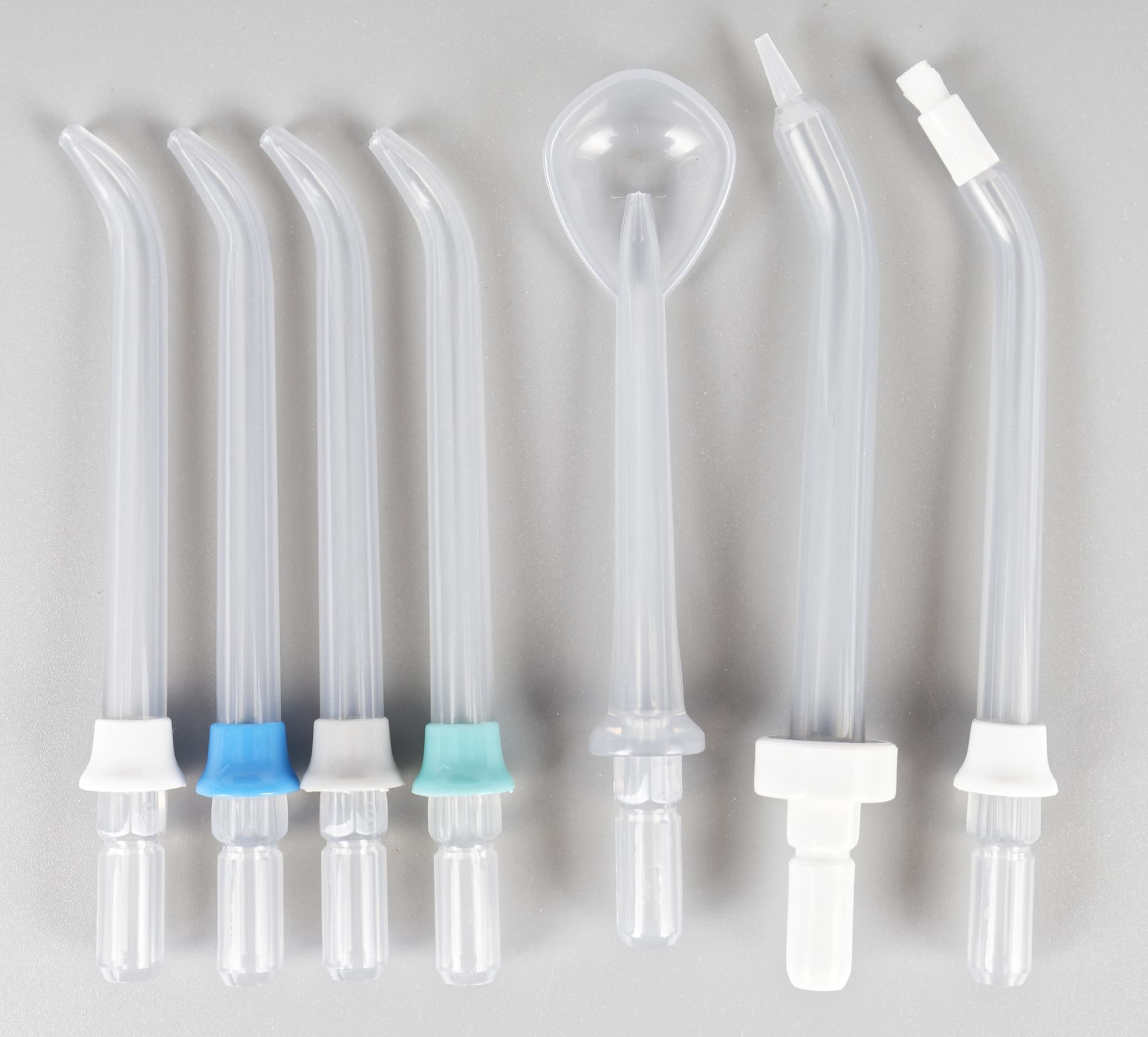 В комплекте к прибору идет 7 насадок — 4 идентичные струйные насадки, которые могут использоваться для ежедневного ухода и распределяться между разными членами семьи благодаря разноцветным кольцам у основания, 1 для чистки языка, 1 ортодонтическая с щетиной, которая подойдет для ухода за брекетами и 1 пародонтологическая с мягким наконечником для чистки десенных карманов.