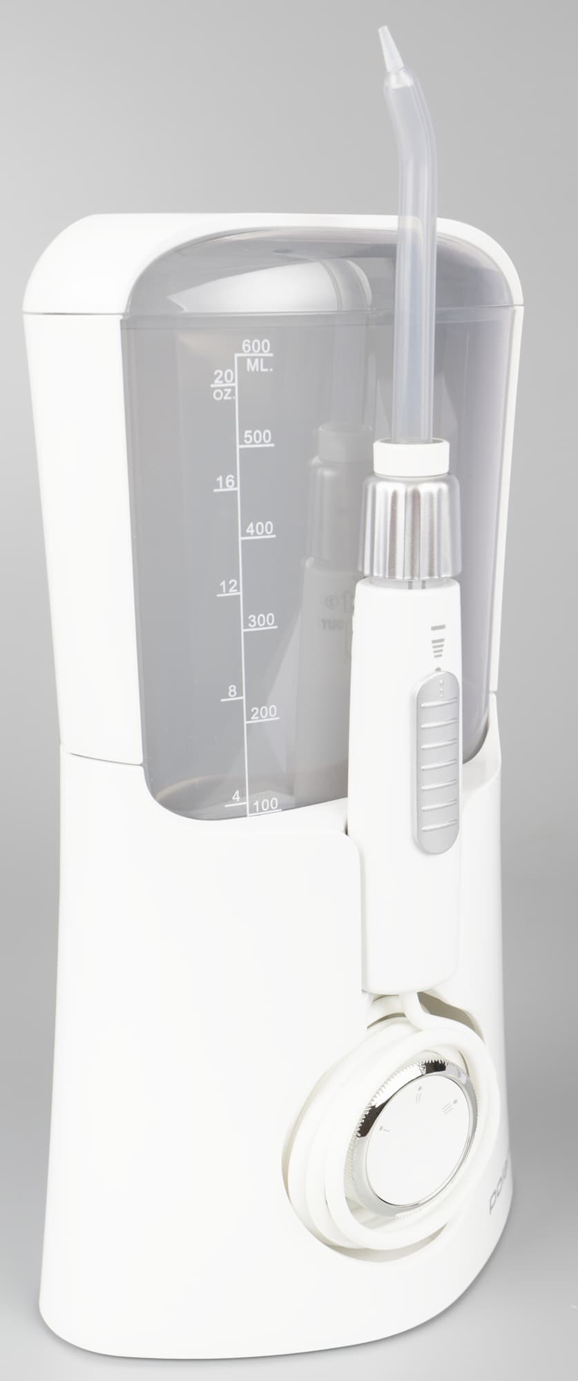 Не секрет, что стационарные ирригаторы несколько крупнее своих портативных коллег. Наш подопытный имеет не слишком большой (но и не маленький) объем бака в 600 мл, что позволяет выглядеть ему изящно и компактно и иметь при этом достаточный запас воды для работы «без дозаправки».