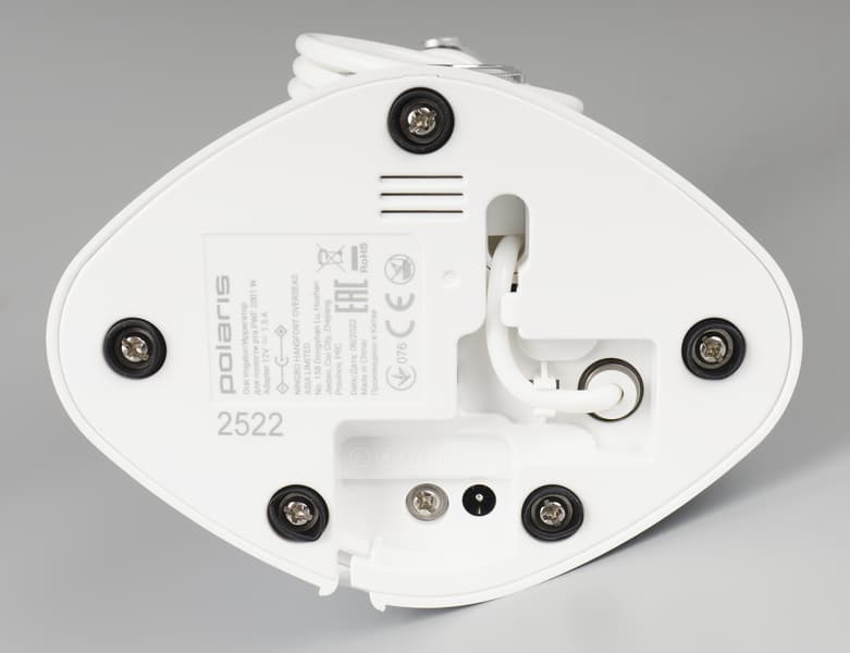 Снизу внимание привлекают наклейка с номером модели и технической информацией, резиновые ножки и разъем для подключения шнура питания. Места для хранения избытков шнура тут не предусмотрено.