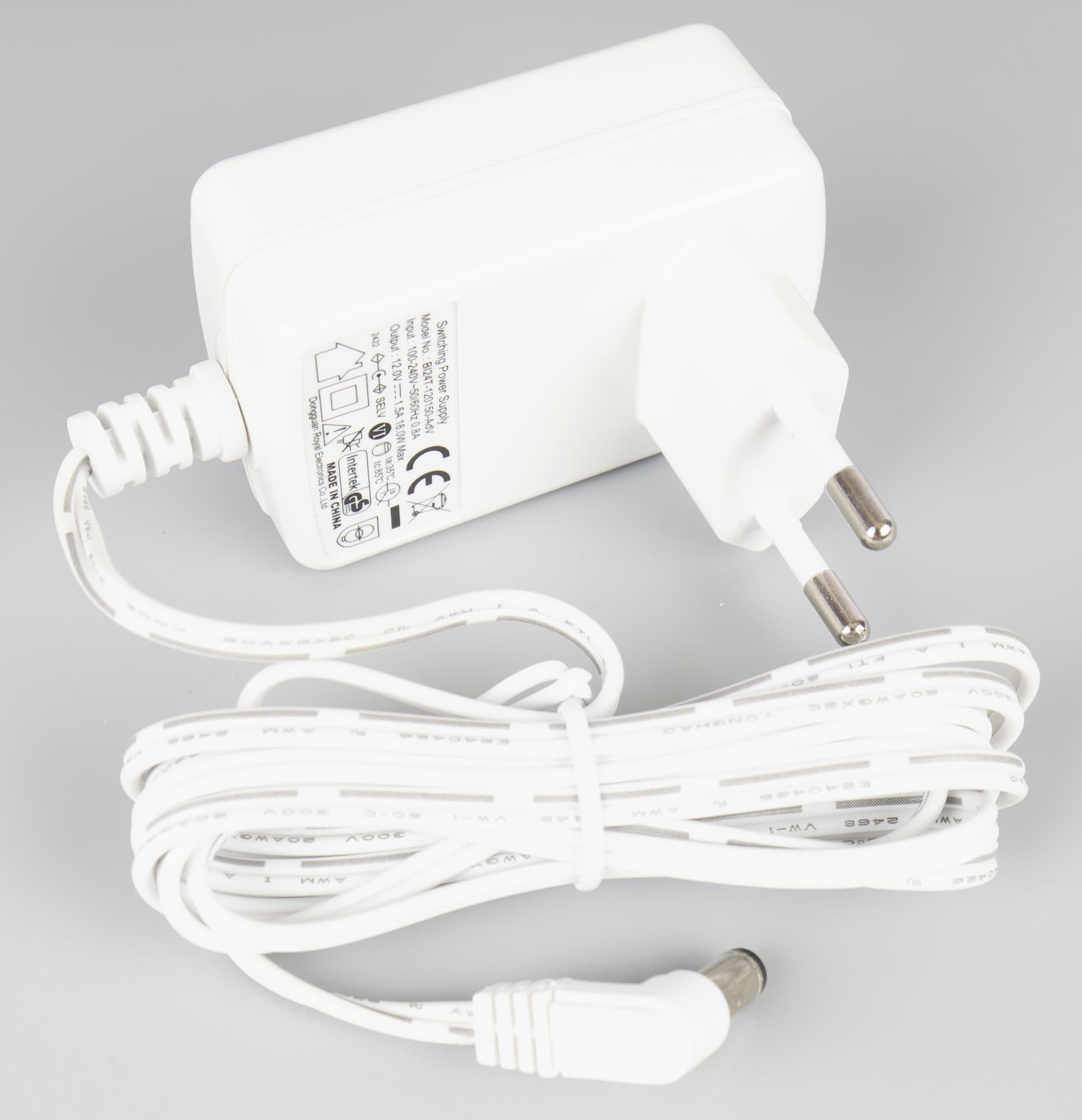 Блок питания имеет круглый штекер и дает на выходе 12 В и 1,5 A. Длина сетевого кабеля — 1,8 метра, чего должно быть достаточно для того, чтобы разместить ирригатор в любом месте ванной комнаты.