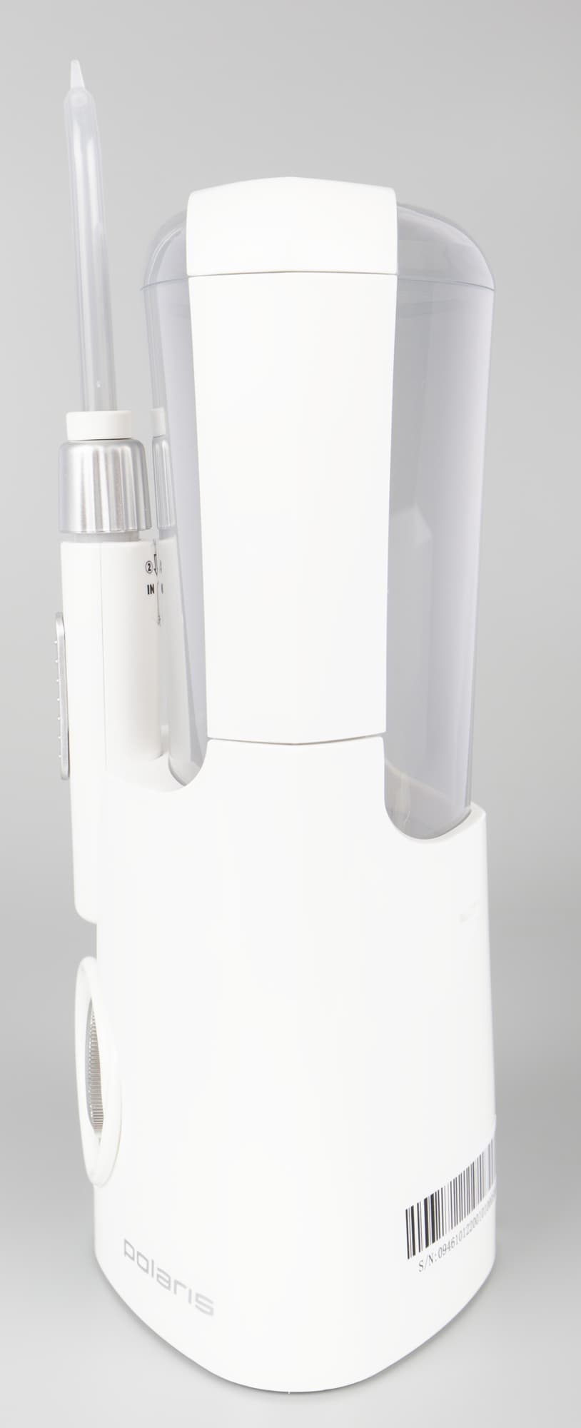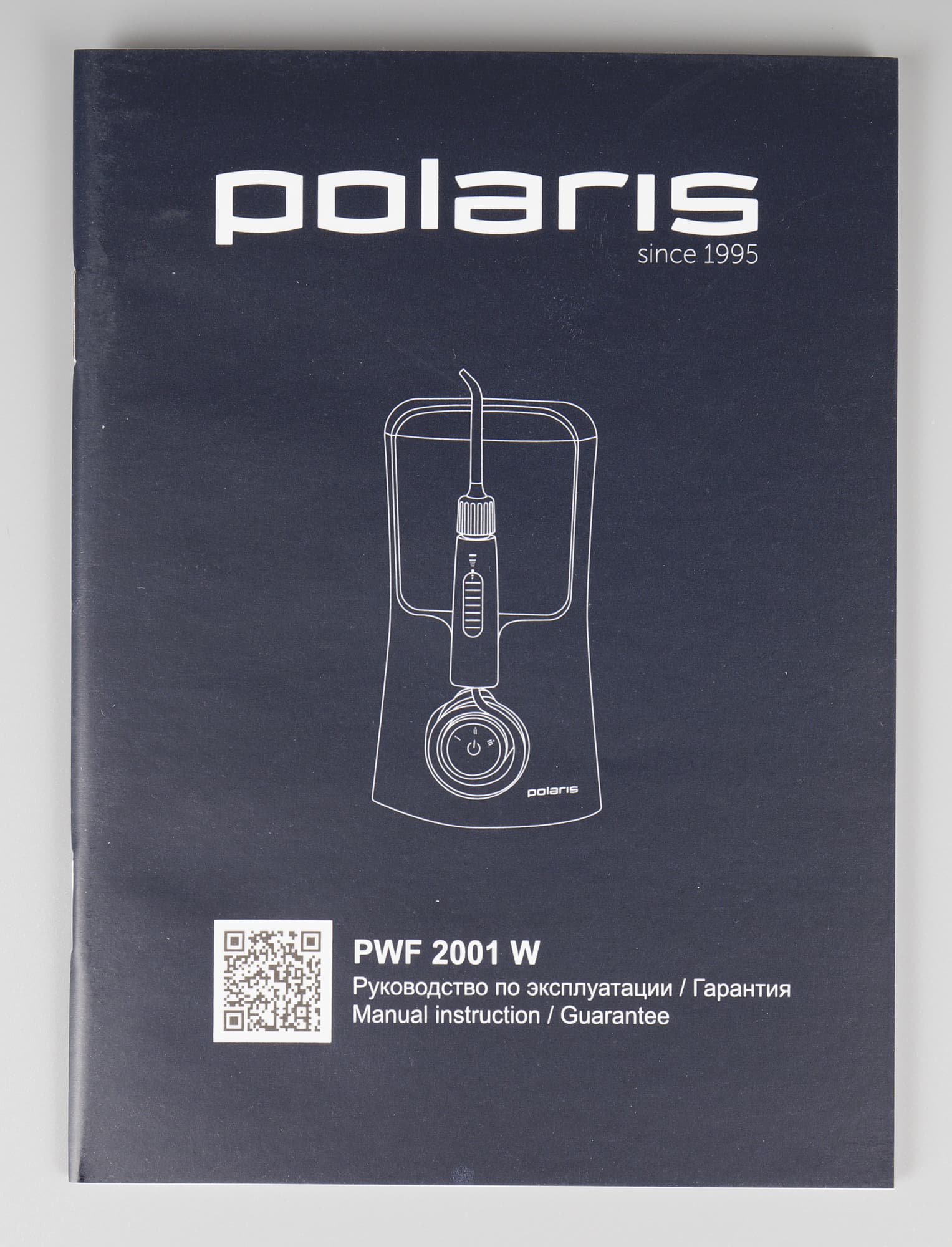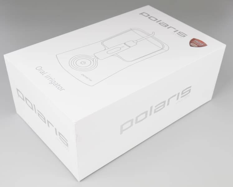 На всех четырех боковых гранях дублируется название бренда, а снизу расположена краткая информация о приборе и производителе на четырех языках, указана цветовая гамма ирригатора, наклеен штрихкод с серийным номером, а также имеется QR-код, ведущий на страницу российского сайта Polaris с данным устройством.