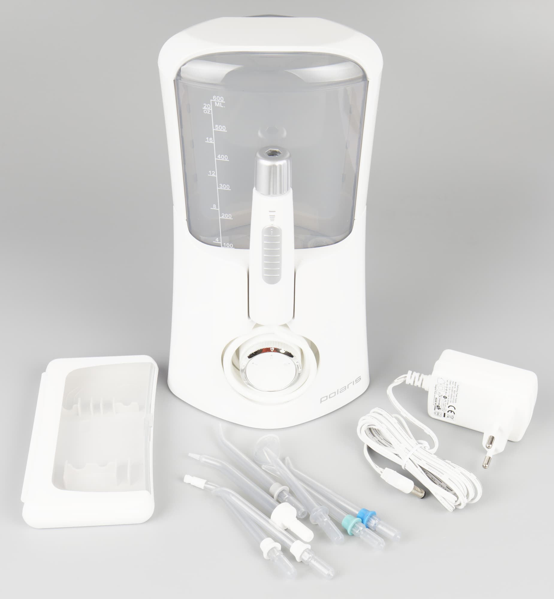 Стационарный ирригатор Polaris PWF 2001 W позиционируется производителем как устройство для всей семьи. Устройство рассчитано на 4 пользователей — в комплекте мы обнаружили четыре стандартные насадки, а также, дополнительно, ортодонтическую, пародонтологическую и одну насадку для языка. Так что теоретически пользоваться им могут и более 4 человек (например, если у дедушки нет зубов, но есть язык — то ему не нужна стандартная насадка, а нужна лишь насадка для языка). Давайте взглянем на это устройство и выясним, на что оно способно.