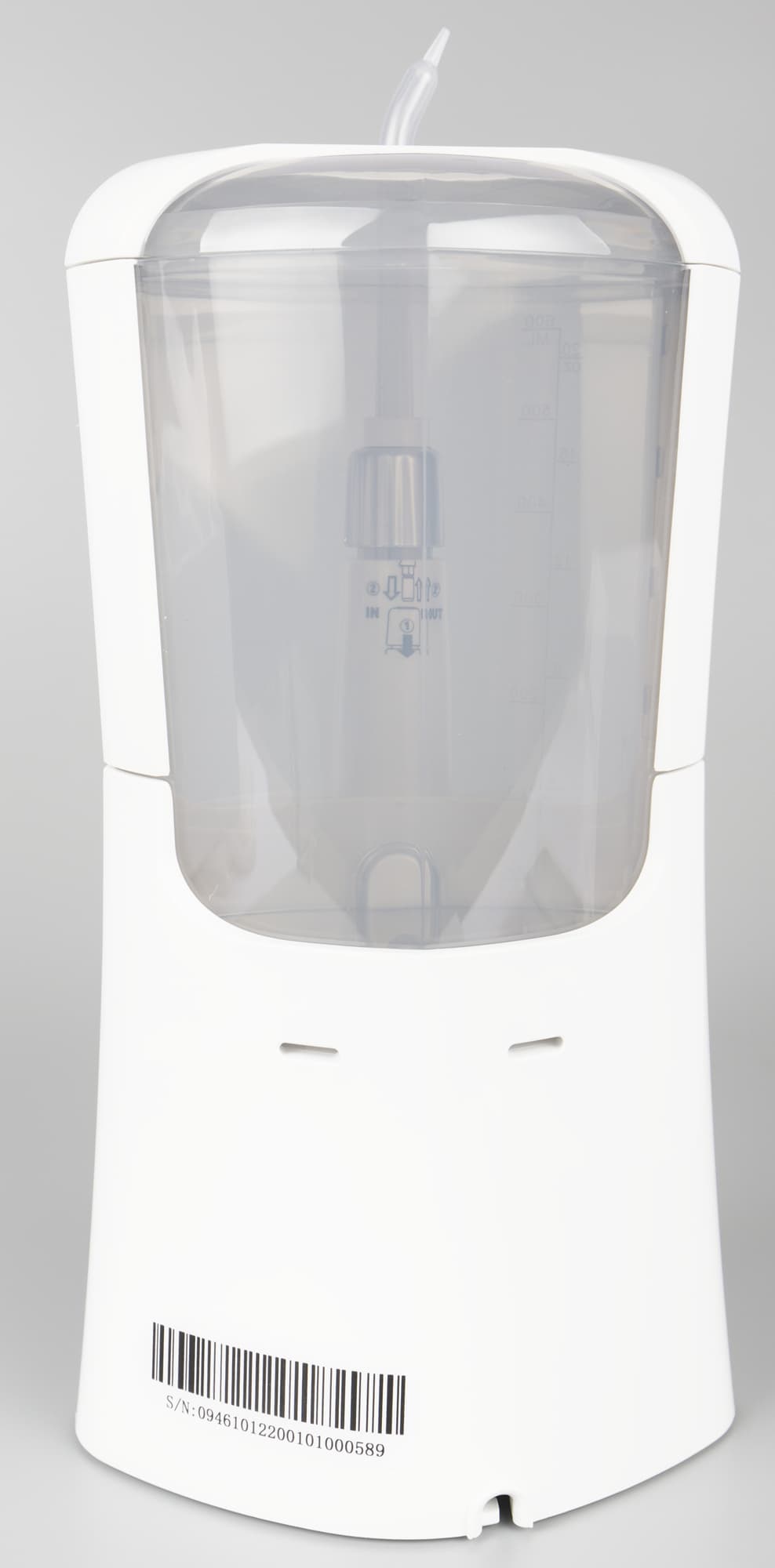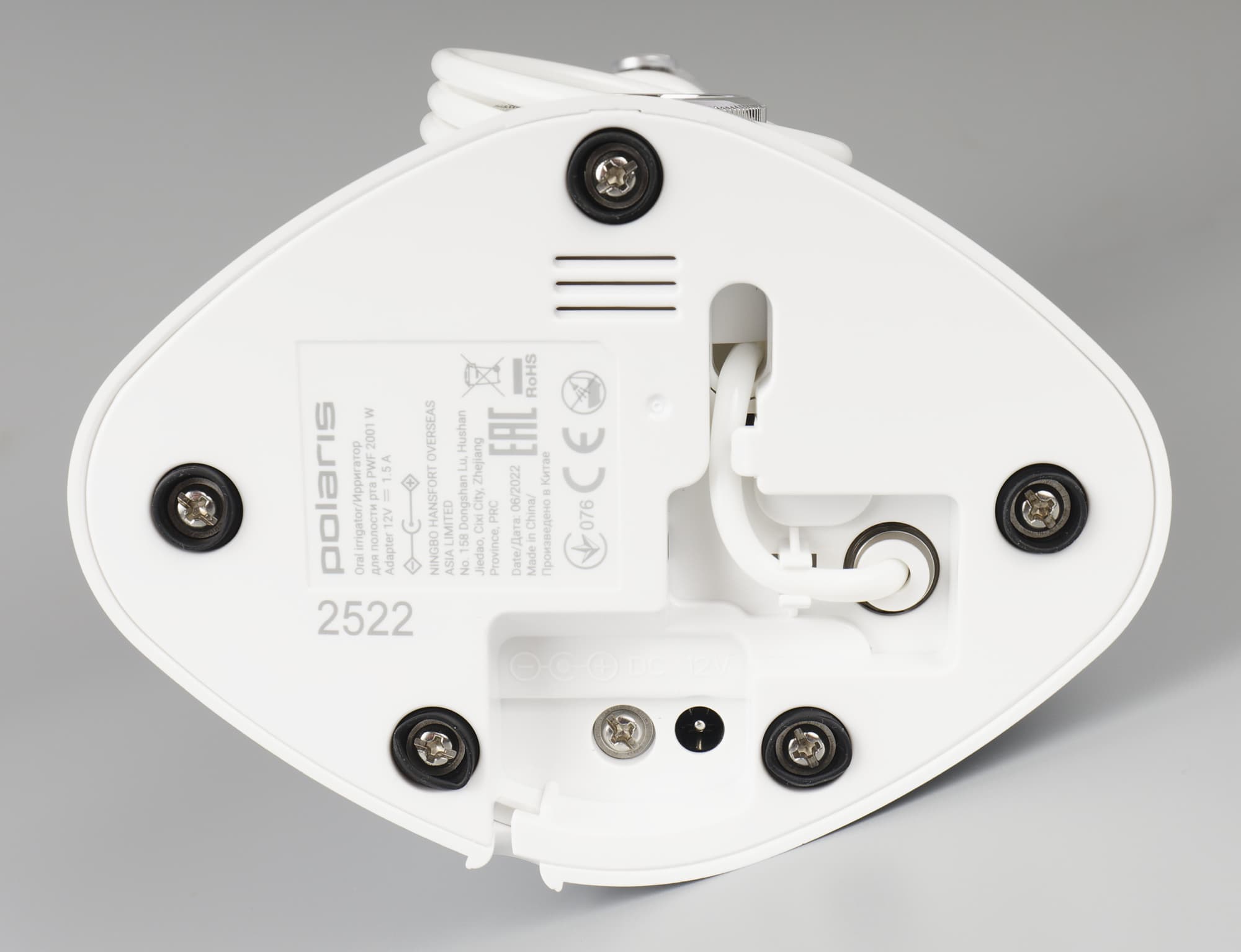 С тыльной стороны у ирригатора нет ничего интересного кроме, разве что, наклейки с серийным номером. В нижней части мы также видим место для выхода шнура питания.