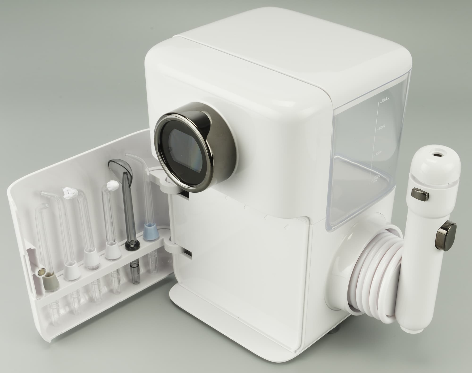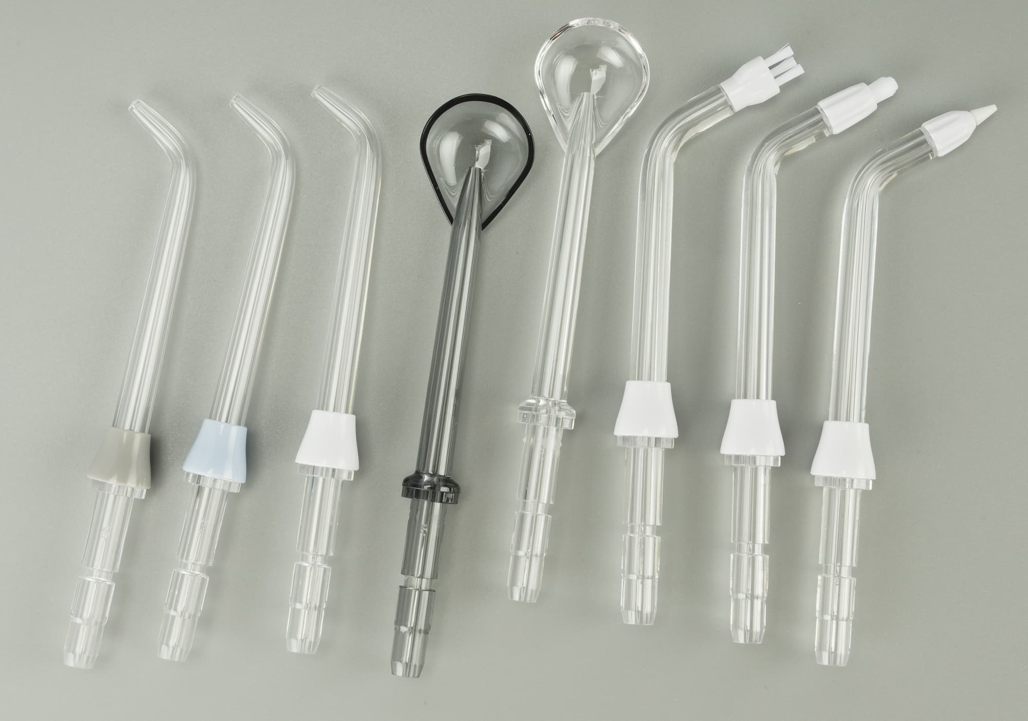 Насадок у прибора 8: 3 сменных стандартных, 2 сменных для чистки языка, по одной ортодонтической (для чистки бреккетов, мостов, коронок), пародонтологической (чистки десневого края и карманов, а также обработки протезов), насадки для удаления налета (у нее есть щетинки). Насадки удобно убираются в специальные держатели в дверце, плюс по окончании работы ирригатора автоматически включается работа UV лампы в этом отсеке для хранения, через 5 минут UV отключается автоматически. Для удобства пользования сменные насадки отличаются по цвету: или специального ободка или самого материала.