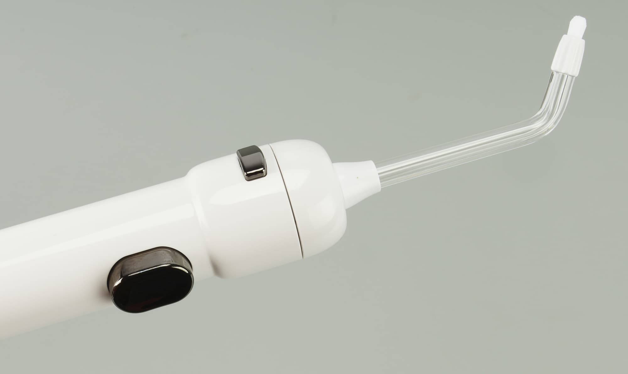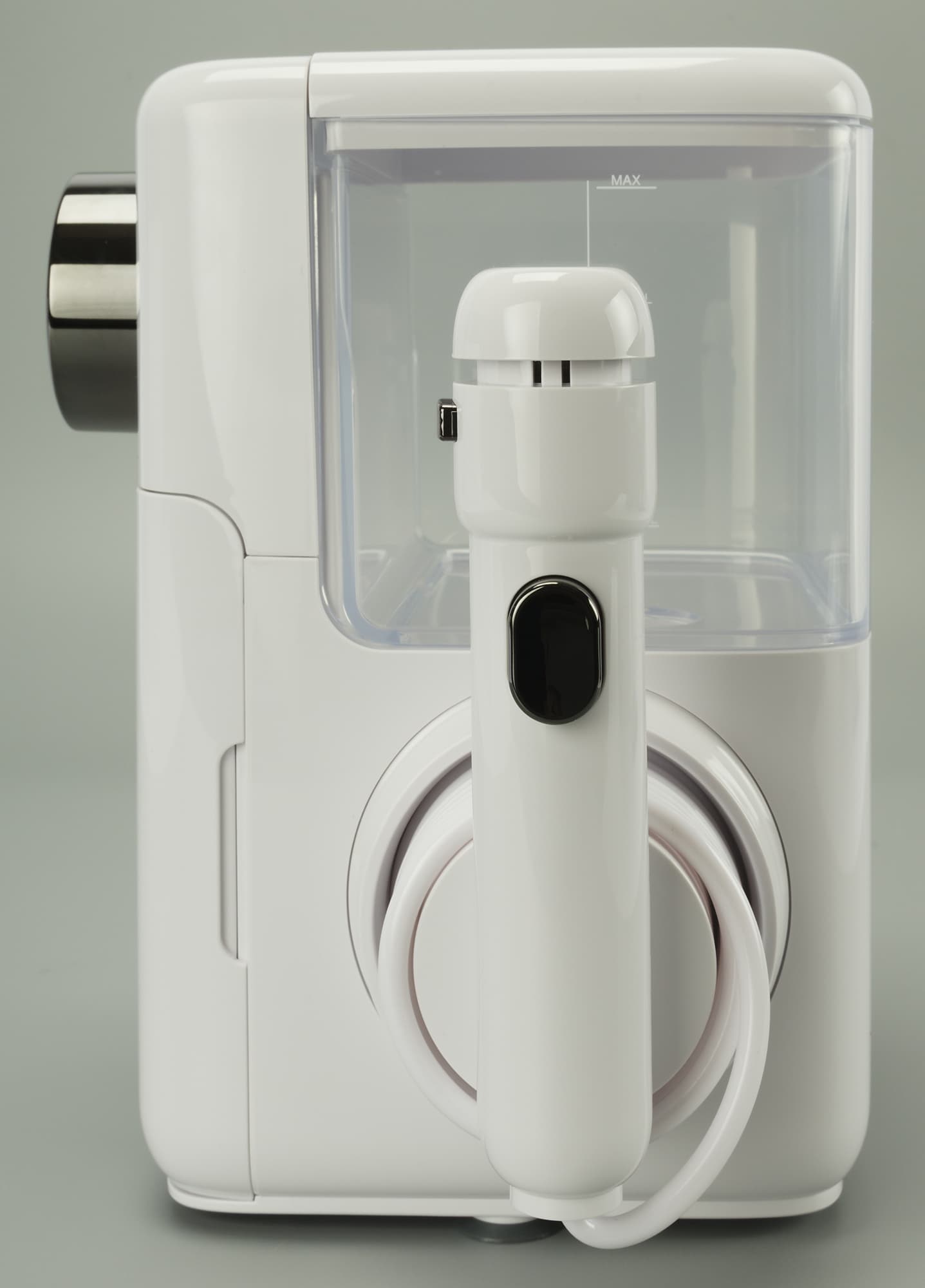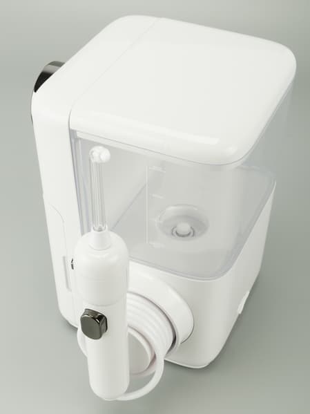 Теперь снимаем с корпуса рукоятку (держатель) ирригатора, направляем насадку в раковину или ванную. Включаем прибор долгим нажатием на ЖК-дисплей, зажимаем кнопку на держателе, вращаем внешнее кольцо — выбираем режим, чистку или массаж, комфортную для себя позу, помещаем насадку в рот и отпускаем кнопку на рукоятке — работа началась.