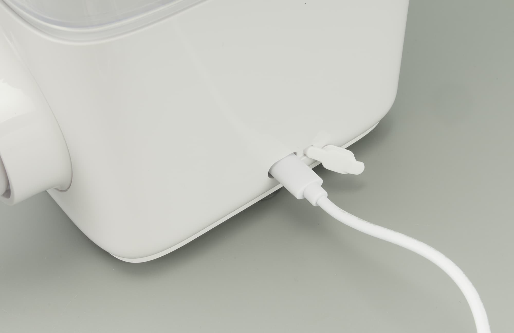Со спины мы видим прозрачный резервуар с фильтром, внизу находим разъем для зарядки. Заряжается Polaris PWF 2004UV Smart Display через USB-провод от ноутбука, компьютера или пауэрбанка, также в набор добавлен адаптер для розетки. Производитель обещает полный заряд за 3-4 часа, подтверждаем: для первой зарядки нам потребовалось чуть больше 3 часов.