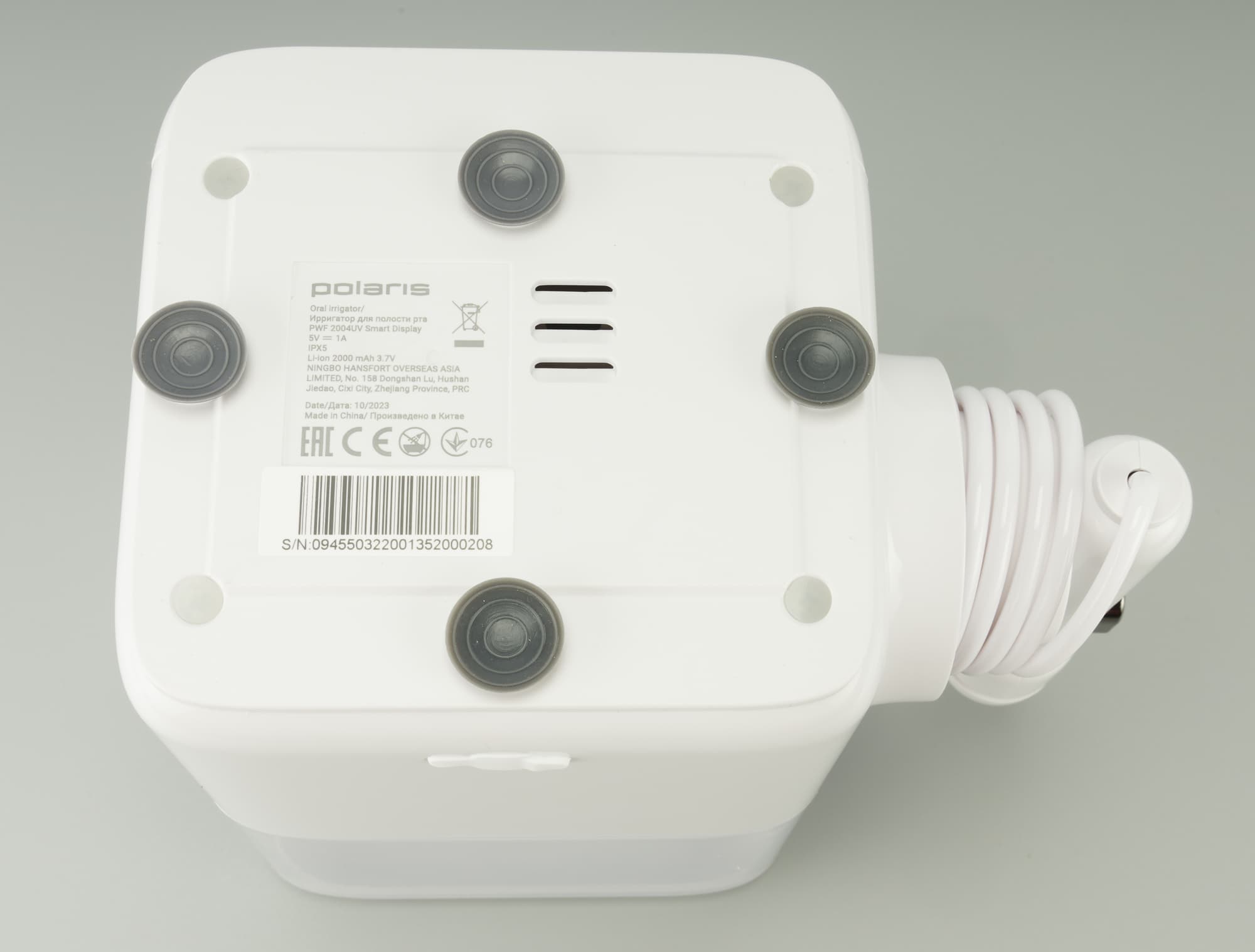 На дне у прибора четыре резиновые ножки, которые отлично «прилипают» к раковине, придавая ирригатору еще большую устойчивость. Снимается прибор легко, после небольшого усилия. Кроме этого на дне нанесены технические данные и штрихкод.