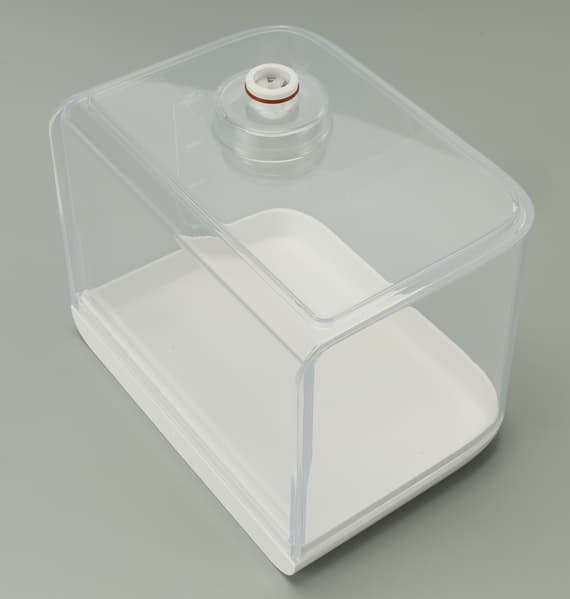 Прозрачный резервуар для воды снимается отдельно, у него собственная крышка из белого пластика, внутрь резервуара специально устанавливается керамический фильтр. Алгоритм установки предельно простой: