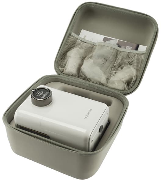 Фиксируется крышка встроенными магнитами, а внутри прибор убран в транспортировочную сумку, у которой есть отделения для каждой детали. Закрывается сумка на молнию, внутри есть ложементы для аккуратной фиксации ирригатора.