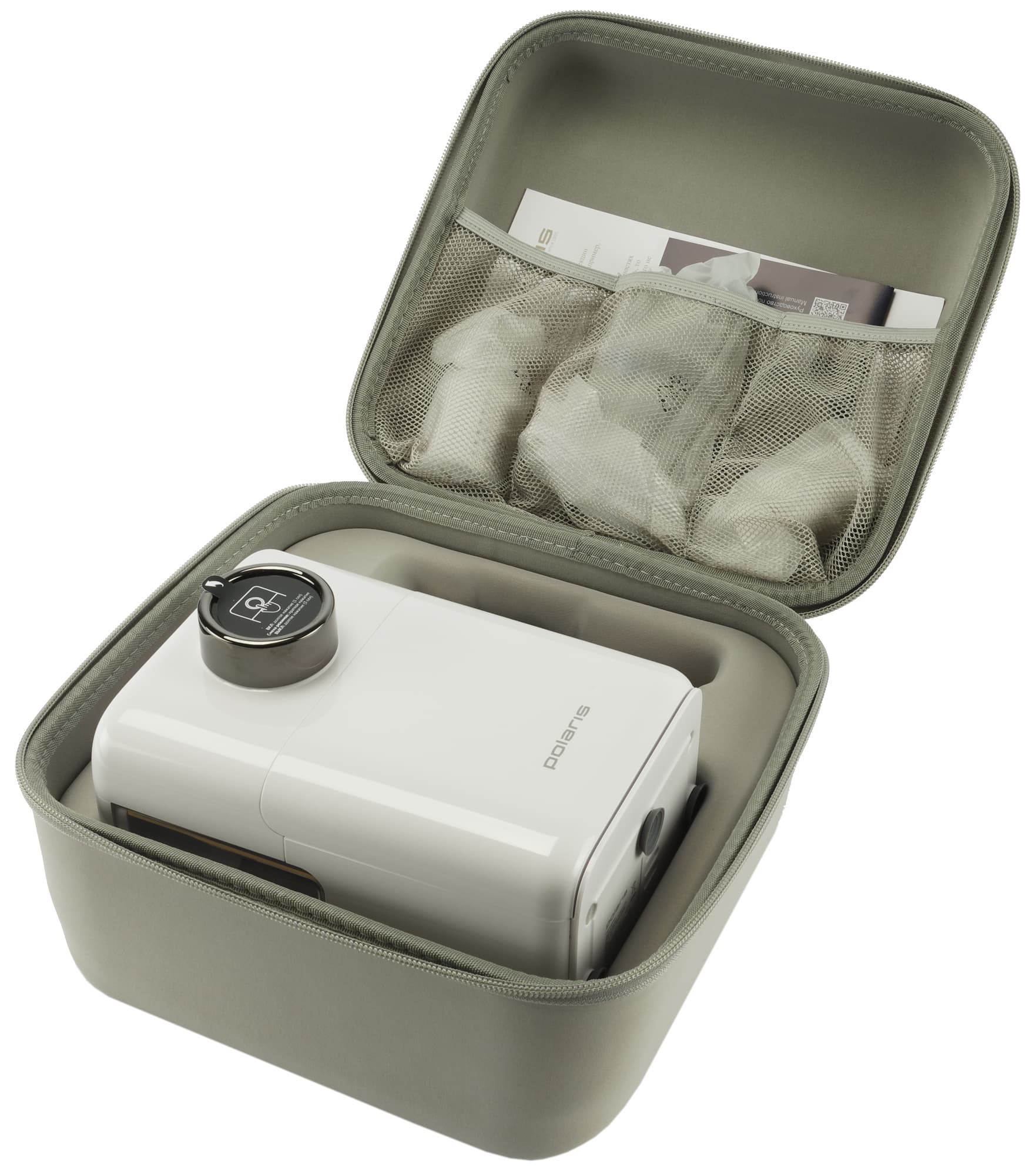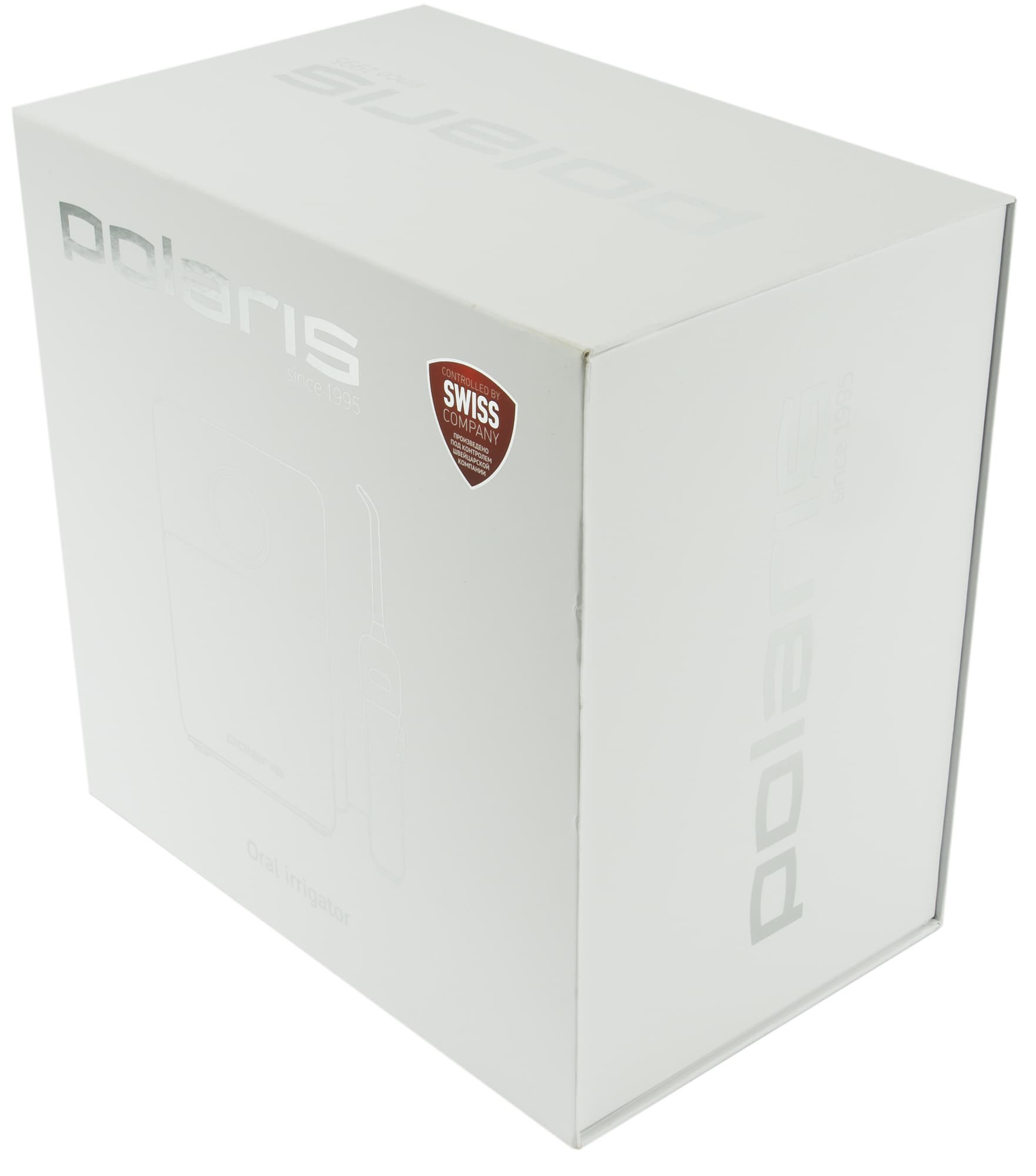 Ирригатор Polaris PWF 2004UV Smart Display на тестирование прибыл в стильной фирменной белой коробке. На крышке — имя бренда, абрис прибора и знак сертификации. На каждой из боковых панелей вынесено имя бренда, а на задней панели полное название модели, схематические обозначения основных преимуществ: 2 года гарантии, работа от аккумулятора, керамический фильтр, 10 режимов работы, два вида пульсации, количество насадок, резервуар на 800 мл и наличие сумки для хранения и транспортировки.