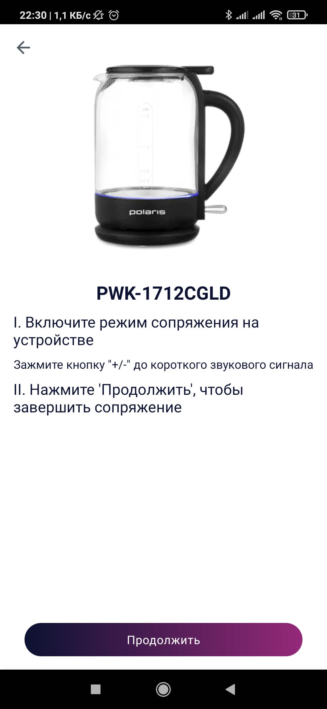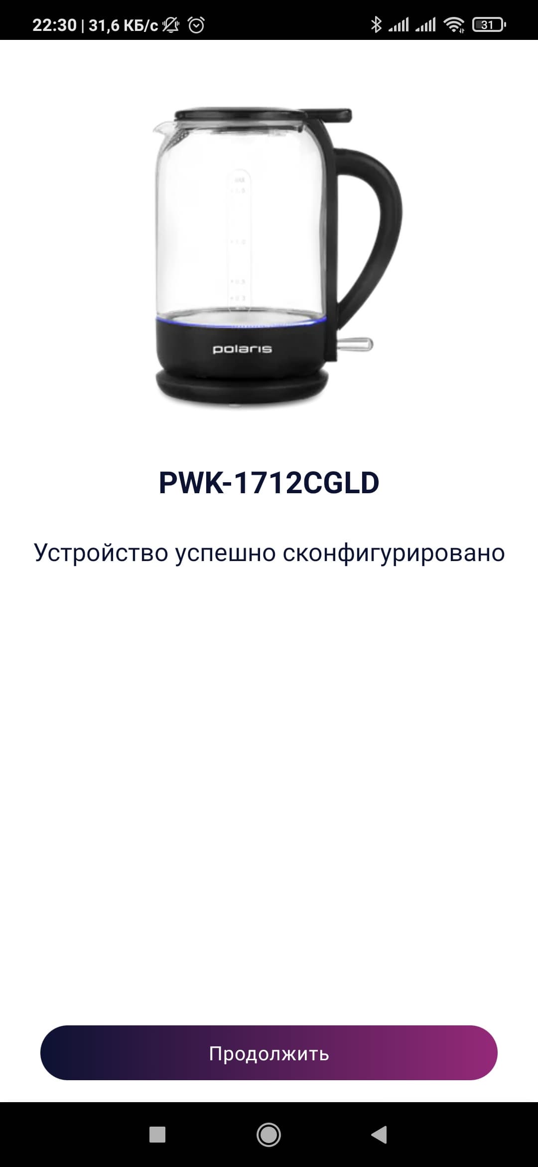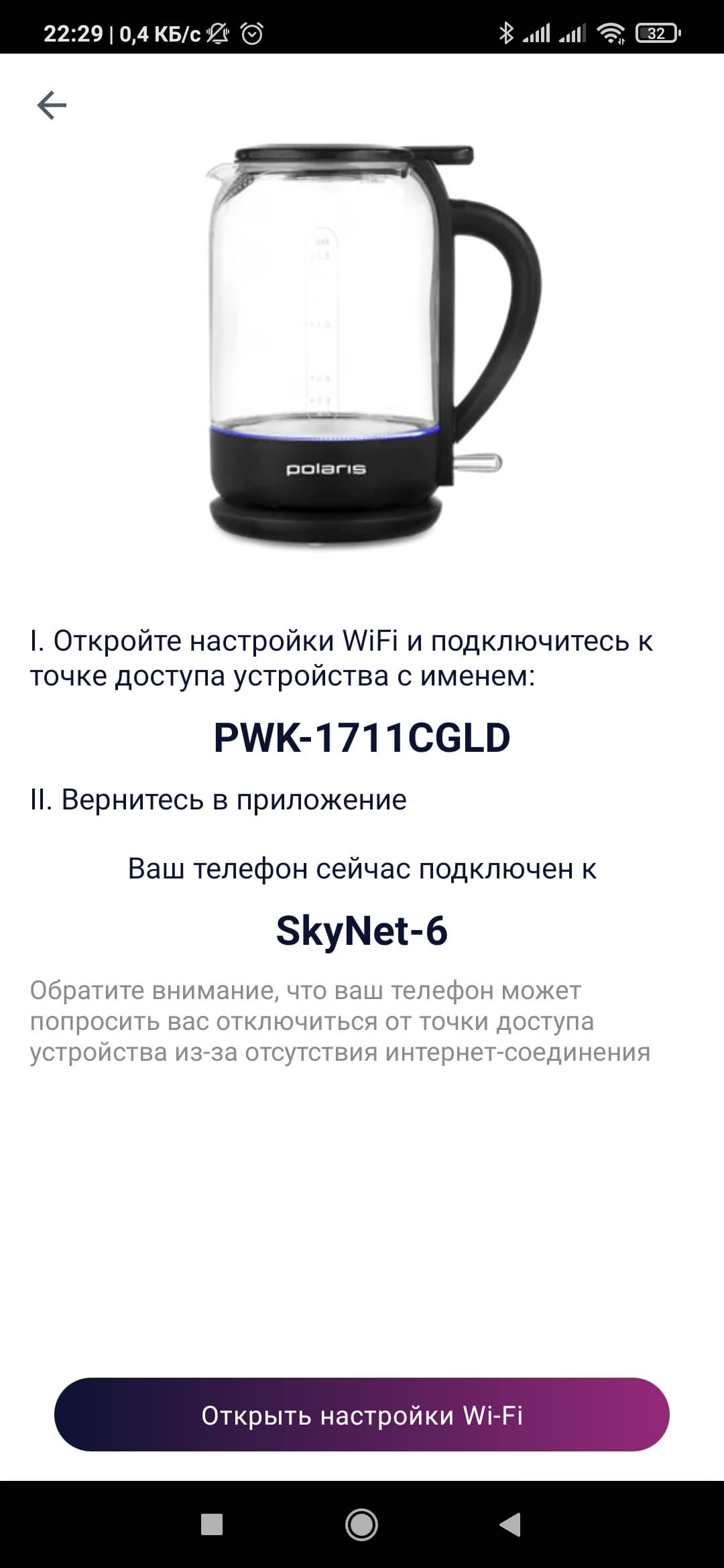 В приложении IQ Home выбираем прибор из списка доступных устройств, подключаемся к чайнику, передаем информацию о домашнем Wi-Fi (название сети и пароль), после чего отключаемся.